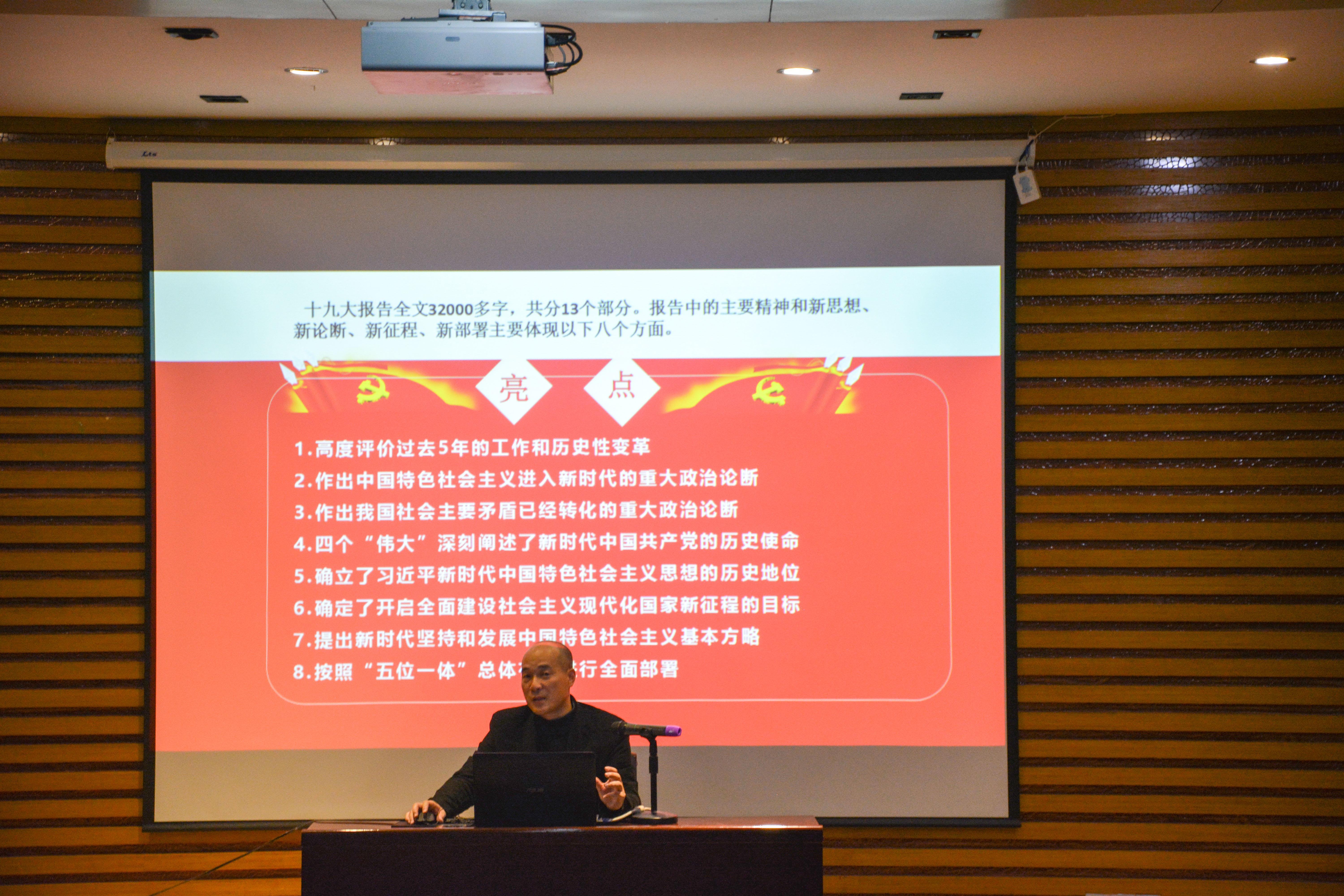 紧接着,詹志华教授讲述了十九大报告中的相关内容,对聆听报告的青年学子寄予厚望。詹志华教授用沉稳又不乏激情的语言分享了十九大报告中的亮点:1.社会主要矛盾的变化;2.习近平新时代社会主义思想的确立。他为同学们梳理了十九大报告中的亮点,让同学们受益匪浅。