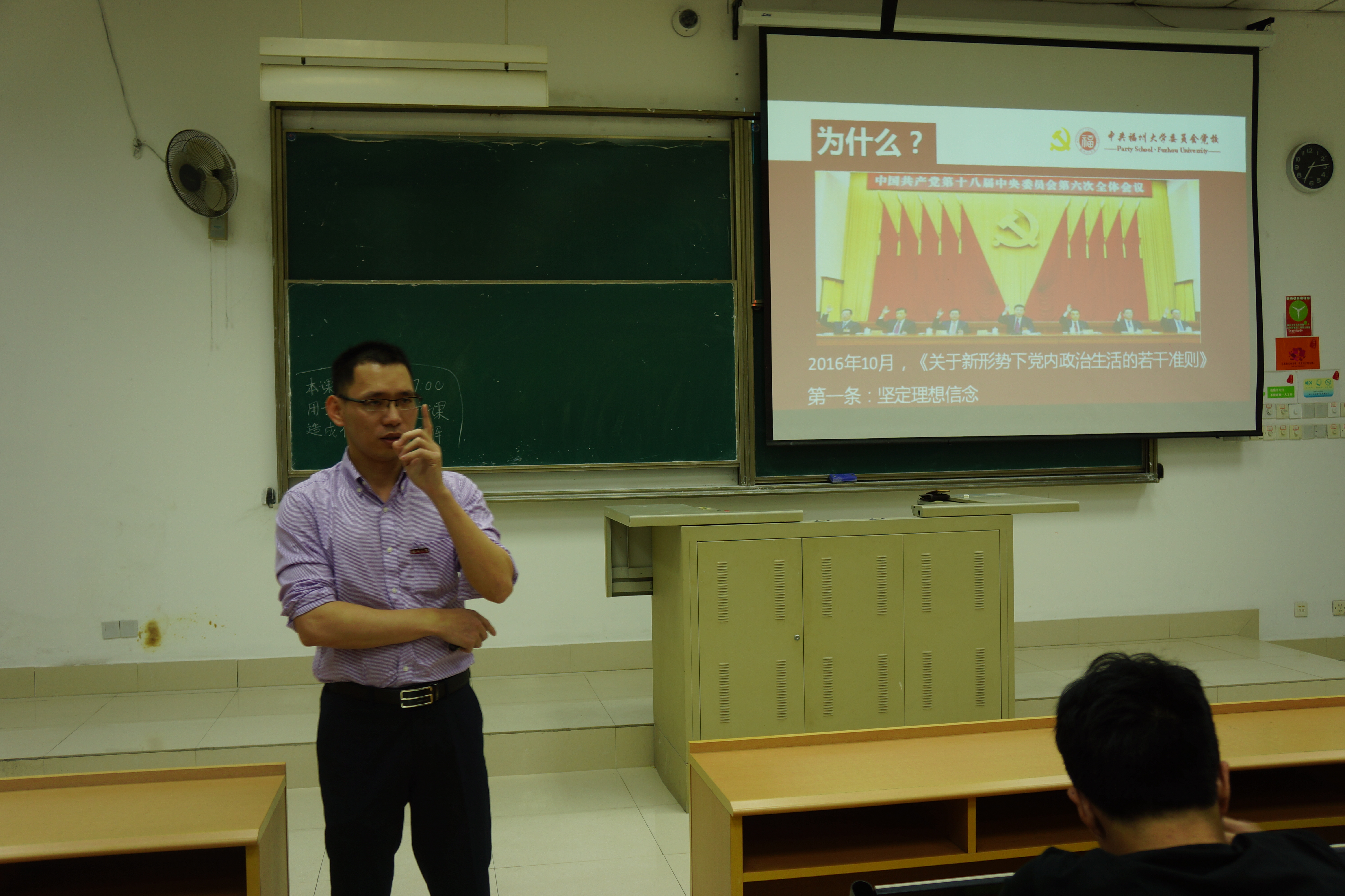 党课伊始,张向宁老师向大家提出三个问题:“为什么要有理想信念?”“要有什么样的理想信念?”“如何坚定理想信念?”接着,张向宁老师向大家解释到思想上的入党是一生一世的,对于每一个人入党的每一个阶段,党课都只有一次,所以我们要珍惜每一次上党课的机会,从中学习党的理想信念。紧接着,张老师分析了大学生的理想信念主体的转变过程,即由抽象到具体。他说到,总体来看,大学生的政治立场坚定,富有社会责任感,主流积极向上。