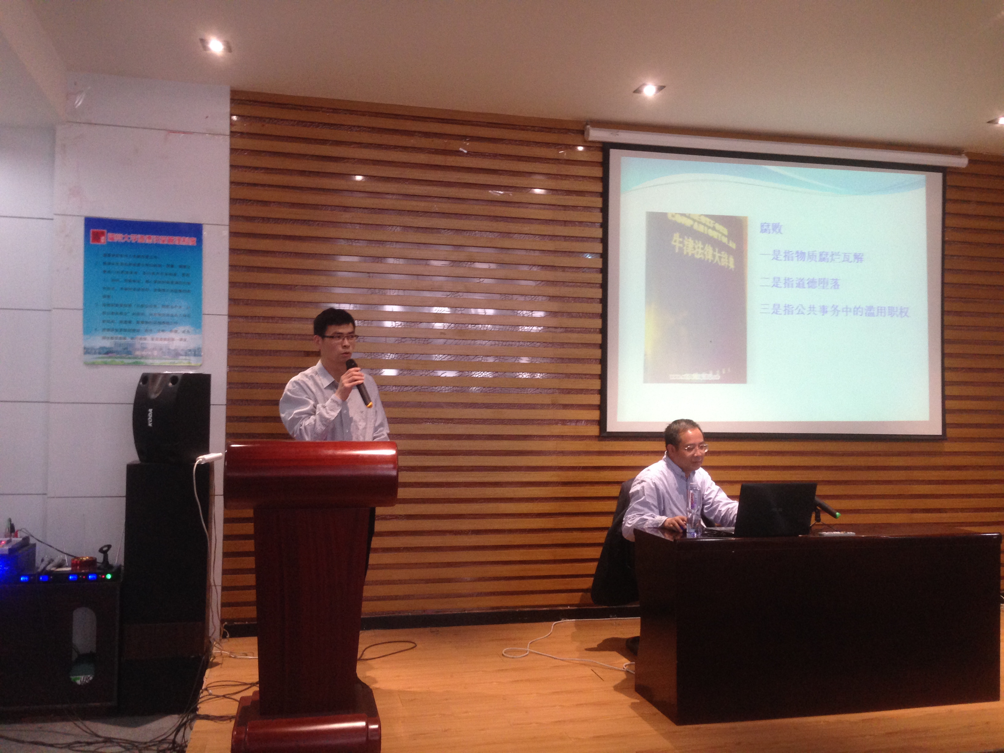 本次讲座的主题是:公正廉明,清廉天下。讲座过程中,何书记首先强调党风廉政建设不仅关系到千家万户,也影响着我们的党风、民风、作风。何书记指出,如今社会上的“特权”思想正在逐步瓦解,从前对干部子女的“关照”慢慢变成了“光照”。他强调只有廉洁、透明的社会才是自由的社会,因此作为入党积极分子,应当摒弃这种落后思想。随后,他还介绍了现今廉政工作的四个重点,提醒入党积极分子要紧随时代的步伐积极投入到党风廉政建设的工作中来,并在此过程中找到人生的价值所在,端正人生态度。在讲座接近尾声的时候,何书记举出了一系列反腐案例,告诫在座入党积极分子必须始终做到守纪律,遵法度。何书记内涵丰富,意义深刻的讲话赢得了在座同学热烈的掌声,最后讲座圆满落幕。
