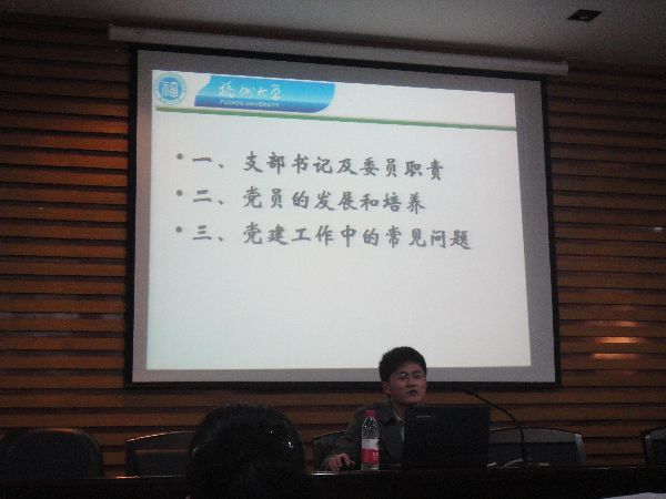 由赖雅利同志主持,宣布讲座开始。接着,王鹏学长给我们带来主题为《如何做好学生党建工作》的讲座。王鹏学长从以下三个方面展开具体阐述:第一,支部书记及委员职责。分别介绍了党支部书记、宣传委员、组织委员的主要职责。第二,党员的发展和培养。这是学生党建工作的重中之重。王鹏学长详细讲述了党员发展和培养的相关工作,具体介绍了党员发展和培养的流程。还强调了思想汇报要对自己一分为二地分析,要注意对个人缺点的认识和改进;以及确定为预备党员后与上级党委老师的谈话要注意的准备工作和细节问题。第三,党建工作中容易发生的问题。主要是各项材料中的时间必须符合逻辑,表格中所填内容的字迹要和签名的字迹一致。提及了一些诸如以后的入党志愿书必须采用十八大后最新的版本,思想汇报成果一般只写一个方面等细节问题。