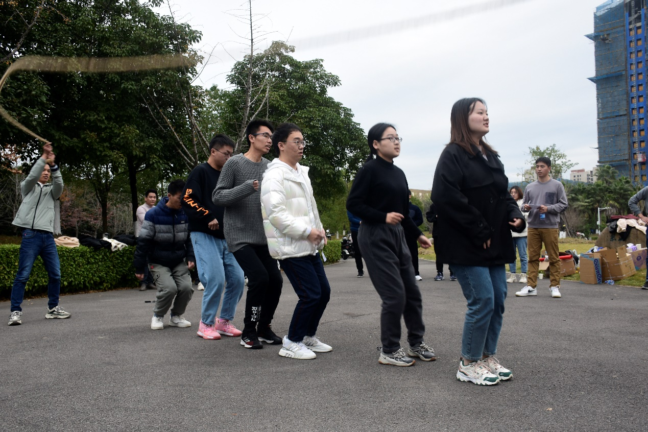 不知是时间过的太快,还是同学们比赛进行的很投入,很快就到了最后一个游戏——跳长绳。两名队员摇绳,其余六名队员一边跳绳一边背诵古诗。各队队员讨论后,纷纷轻装上阵,大家配合十分默契,背完一首古诗后又继续跳了很久。由此可见,干部们不仅科研能力强、合作意识好,身体素质也很强。