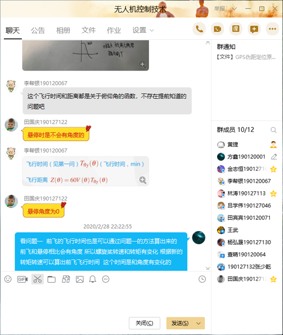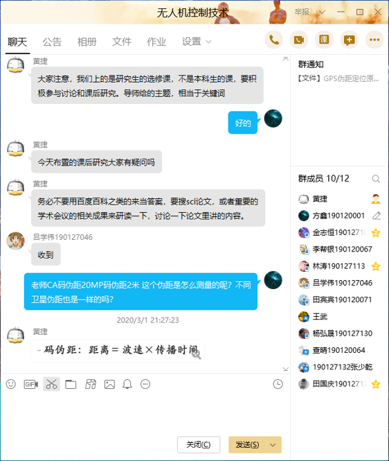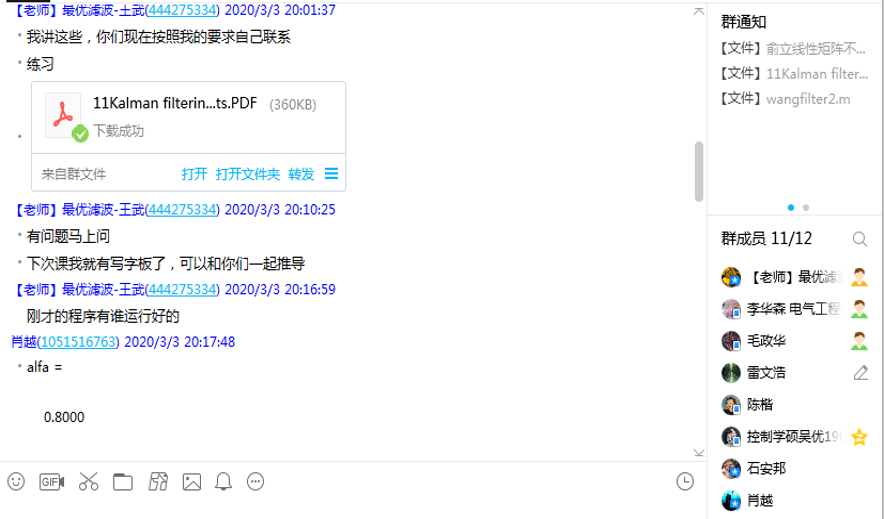 王武老师每次在上课前,都会招呼一下,确定同学们都在线之后,才会开启群视频。尽管是在晚上9-11节上课,但丝毫不影响老师与同学们讨论的热烈氛围。《最优滤波》是一门理论性较强的课程,涉及多阶矩阵、线性系统理论等与数学有关的内容。王老师诙谐的话语,让原本难以消化吸收的理论变得生动有趣。在下课之余,王老师也要求我们自己推导一遍公式,他说:“只有自己推导过一遍,才能够真正明白”。是的,实践出真知,光看不写是无法体会到课程的真正精髓,推导过程中问题的接连出现又不断解决,这才是真实的进步,能力才能得到质的提高。