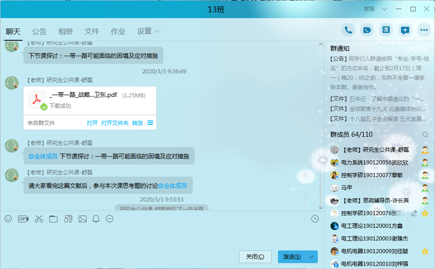 由于此次疫情的影响,本来应该在课堂中进行的理论课程,已经转变为网课的形式进行授课,本课程由黄宴委老师进行线上指导。每次上课前,老师都会确认每位同学的在线情况。