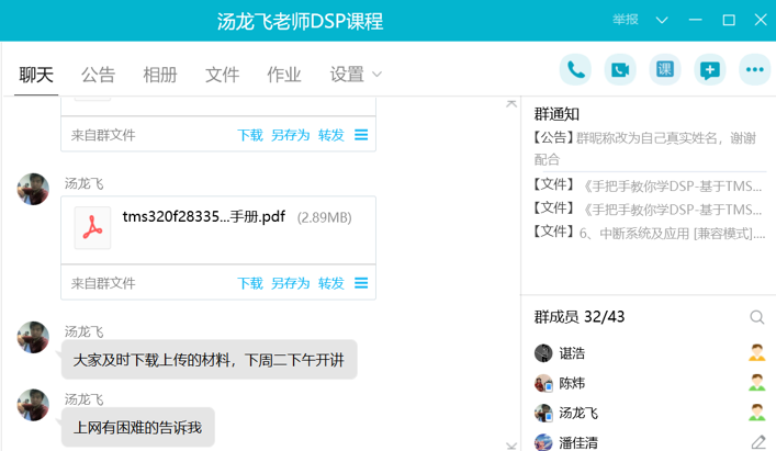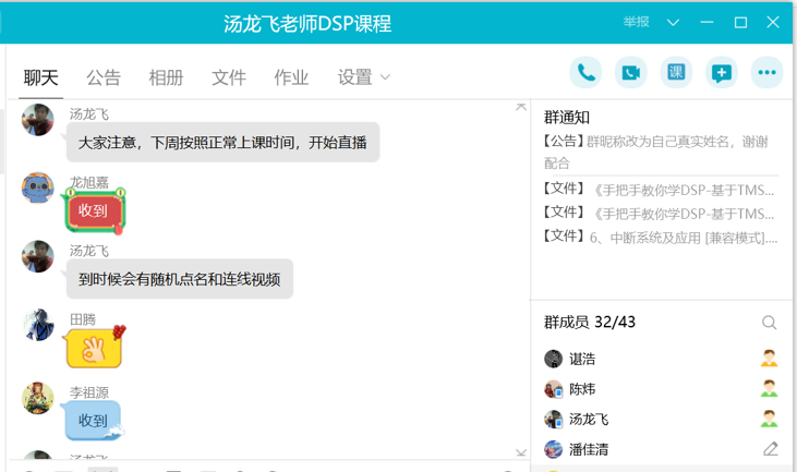 汤龙飞老师在每次上课结束后,都会把下次要讲内容的资料上传,告诉我们哪些是重点,这样我们可以提前进行针对性预习,留意不懂之处,以便课堂答疑。DSP这门课程主要是涉及到语言的汇编,只学理论知识的话,相信大多数同学会一头雾水,而汤老师考虑到了这一点,他会在课上给我们演示一些实际的例子,怎么去看懂、怎么去分析、怎么去编写,这样理论和实际相结合的教学方式,让原本觉得枯燥的课程学起来轻松了许多。当老师讲解实例时,会更加引起同学们的学习兴趣。虽然是网上授课,但汤老师每次上课都带给大家积极的引导,精神饱满,语言幽默,让身处疫情中的同学们的生活多了一些乐趣。