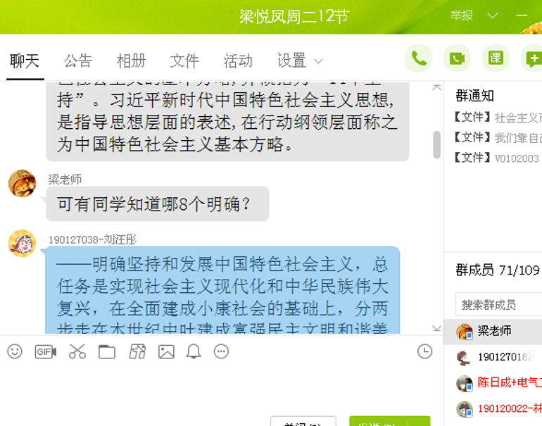 虽然每周只有两节课,同学们却收获满满。无论是前期的课件制作还是课上的知识扩充,梁老师准备的都非常充分。老师们的课堂内容丰富多彩,经常会穿插一些视频在课程中,通过观看视频可以让大家更容易理解和吸收课堂知识,同时也让原本枯燥无味的课程学习起来变得有滋有味。课堂上大家积极讨论,气氛非常活跃,让原本大家眼中枯燥无味的思政课变得更加轻松、有趣。通过三周的网上学习,我们从不适应线上教学到依赖云课堂,疫情虽然阻挡了我们汇聚一堂,但阻挡不了我们的求学之心,感恩当今的中国,让我们做到了“停课不停学”。