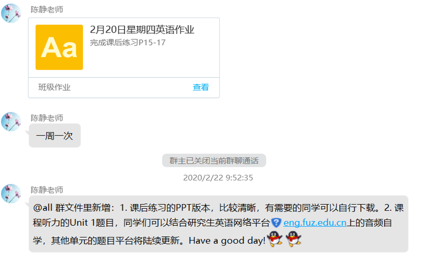 本学期初的英语课与以往有点不太一样,由于受到疫情影响,陈静老师的英语课通过QQ语音进行网上授课。为保证课堂质量,认真负责的陈老师在授课前一周进行试课,调试设备。课前,会提前将上课所需的电子版文档以及听力语音上传到群文件,让大家通过课前学习以便更好的进行课堂互动。