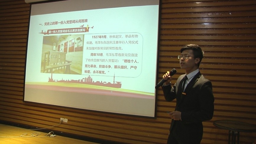 第五位出场的是电气工程研究生第二党支部书记万志松,他的微党课题目是《释读入党宣言 坚定为党初心》。万志松同志以一段格外引人振奋的入党誓词开始他的微党课,向我们介绍了党史的第一份入党誓言从何而来并对入党誓言进行解读,并指出新时代我们作为研究生党员要求知求新,从身边事做起。