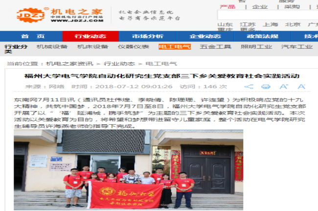 关爱弱势群体,出行社会实践。行是知之始,知是行之成,自动化人服务学院师生的同时,关爱留守儿童,投身社会实践。2018年7月,支部自行组织开展了以“‘福’延浦城,携手筑梦”为主题的三下乡关爱教育社会实践活动,呼吁监护人多和孩子交流,多了解孩子情况,为教育助力,凝聚力量,共筑中国梦。此次活动在东南网、机电之家、东方头条等网站均有相关报道。