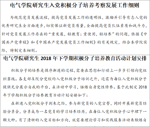 研究生入党积极分子培养考察发展工作细则》严格执行,每月填写《入党积极分子活动登记表》,学期末将会得出积极分子的综合评分,最后参考多学期综合表现公开公正确定拟发展对象,以此激励并引导有志入党的优秀研究生全方面进步,切实保证新党员质量,全面提高党员队伍素质和战斗力。