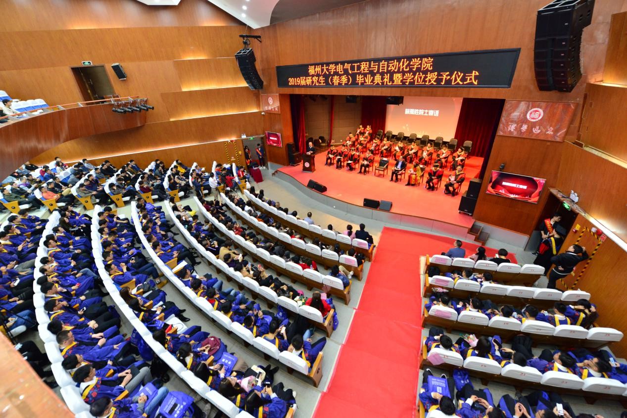 典礼伊始,在优美的交响乐《沃尔塔瓦河》的乐声中,同学们庄严并立在红地毯两侧,手捧鲜花欢迎导师们入场,并向恩师们献上自己精心挑选的鲜花。伴随着鼓舞人心的国歌声,毕业典礼暨学位授予仪式正式拉开帷幕。首先是副校长杨黄浩教授致辞,杨校长期望我们能够永葆自己的先进性,发扬“福大明德至诚,博学远志”的校训,实现“达则兼济天下”的理想,为社会和国家贡献自己的才能。第二项议程是薛禹胜院士寄语,薛老语重心长地讲述自己年轻求学的种种经历,教诲我们年轻一代要珍惜现有的大好条件,刻苦努力,不忘初心。随后,薛老亲自为毕业生汤云东博士执拨穗礼,杨校长为其颁发了博士学位证书。伴随着鲜花,学生代表在台上朗诵了一首《三月春风》,为毕业生送上了最美好的祝福。