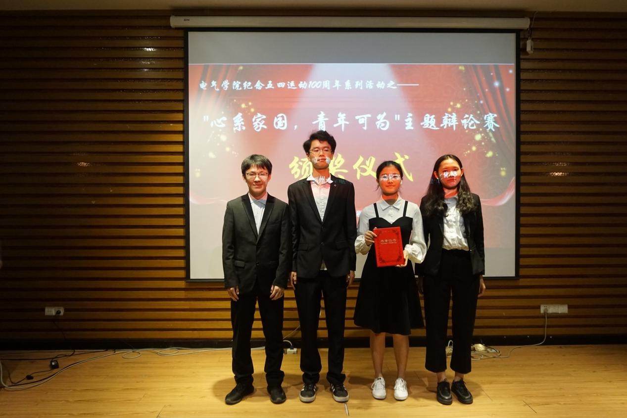 至此,近两个小时激烈地唇枪舌战终于落下了帷幕。获得一、二、三等奖的队伍分别是:“模电数电单片机啥也学不会队”、“小猪佩奇队”和“电气一队”。获得优秀奖的是:“老白最帅队”。最佳辩手分别是谢永鑫和张一博同学,最后由许海燕老师上台为获奖队伍和选手颁奖,并合影留念。本次辩论赛为同学们提供了一个展现自我、提升自我的平台,更将广大电气学子作为新时代新青年的激情与活力展现的淋漓尽致。