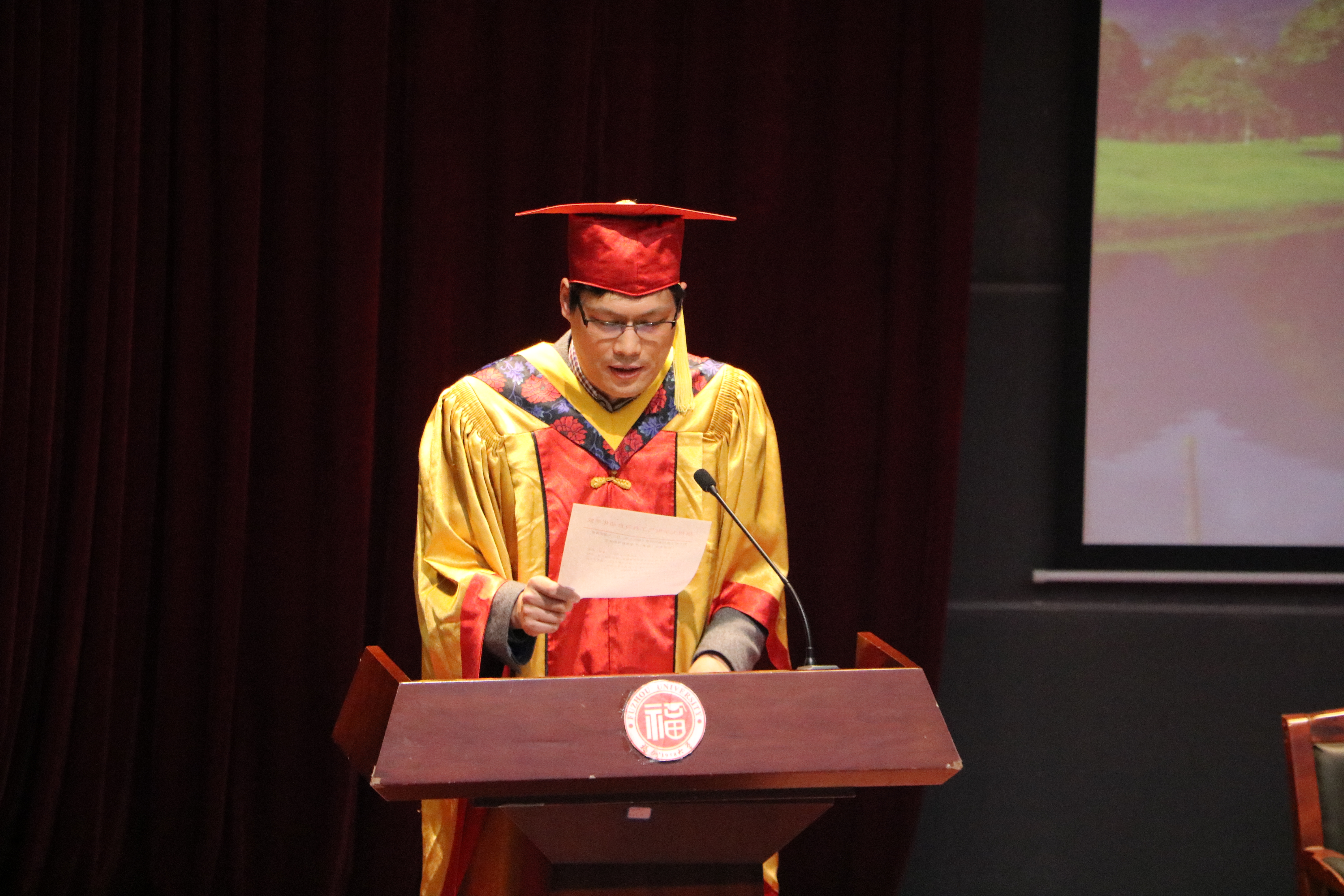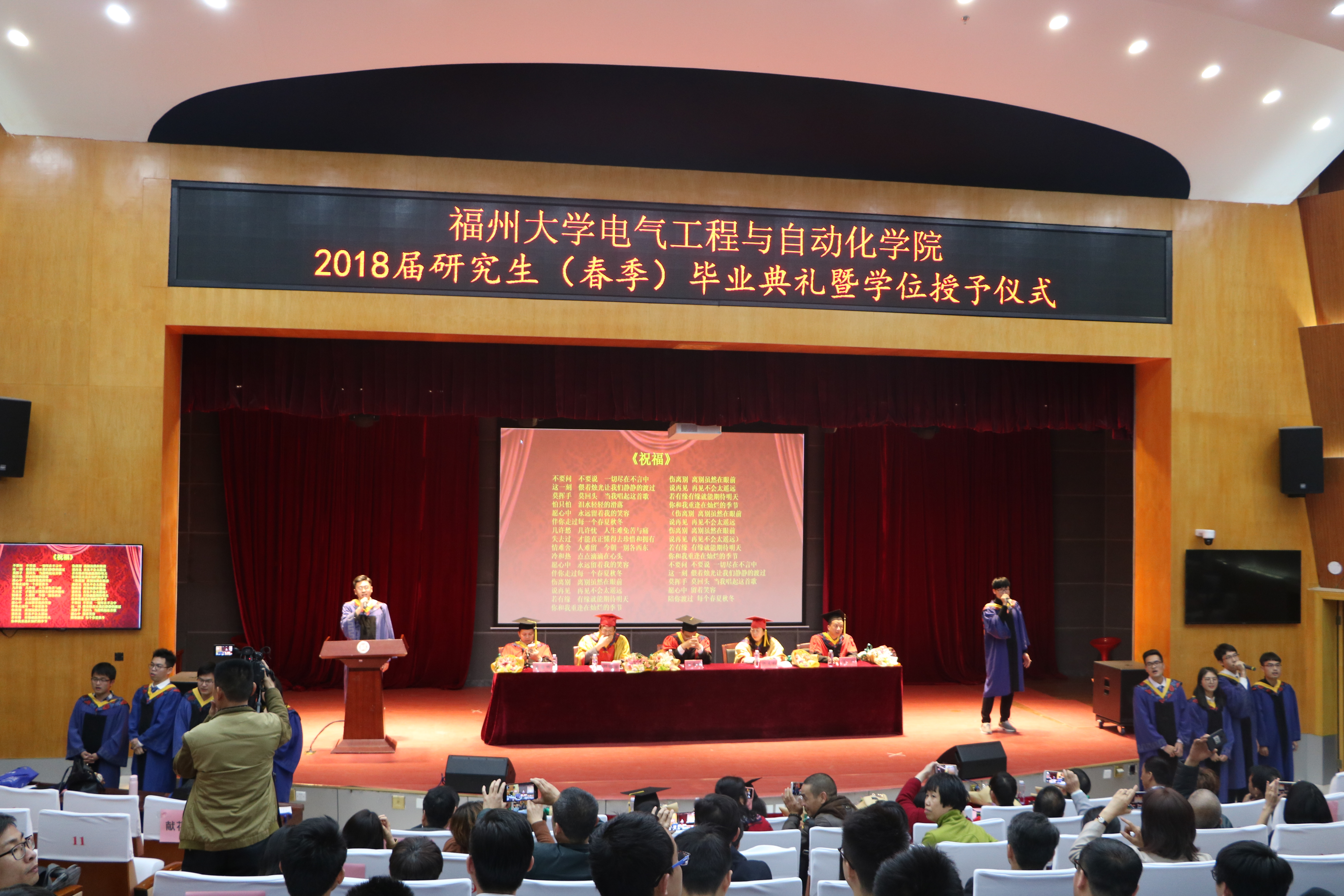 在鼓舞人心的国歌声里全体起立奏唱国歌,学位授予仪式正式开始。副院长邵振国教授宣读了优秀毕业研究生表彰决定,何希耕书记和许志红院长为优秀毕业研究生获得者颁发荣誉证书。毕业研究生代表、上一任学院研究生会主席林子良上台发言,表达了对母校两年半培育之恩的感激,并向各位老师献上精心挑选的鲜花。伴随着鲜花,学生们还在台上合唱了一首《祝福》,送上了最美好的祝福。