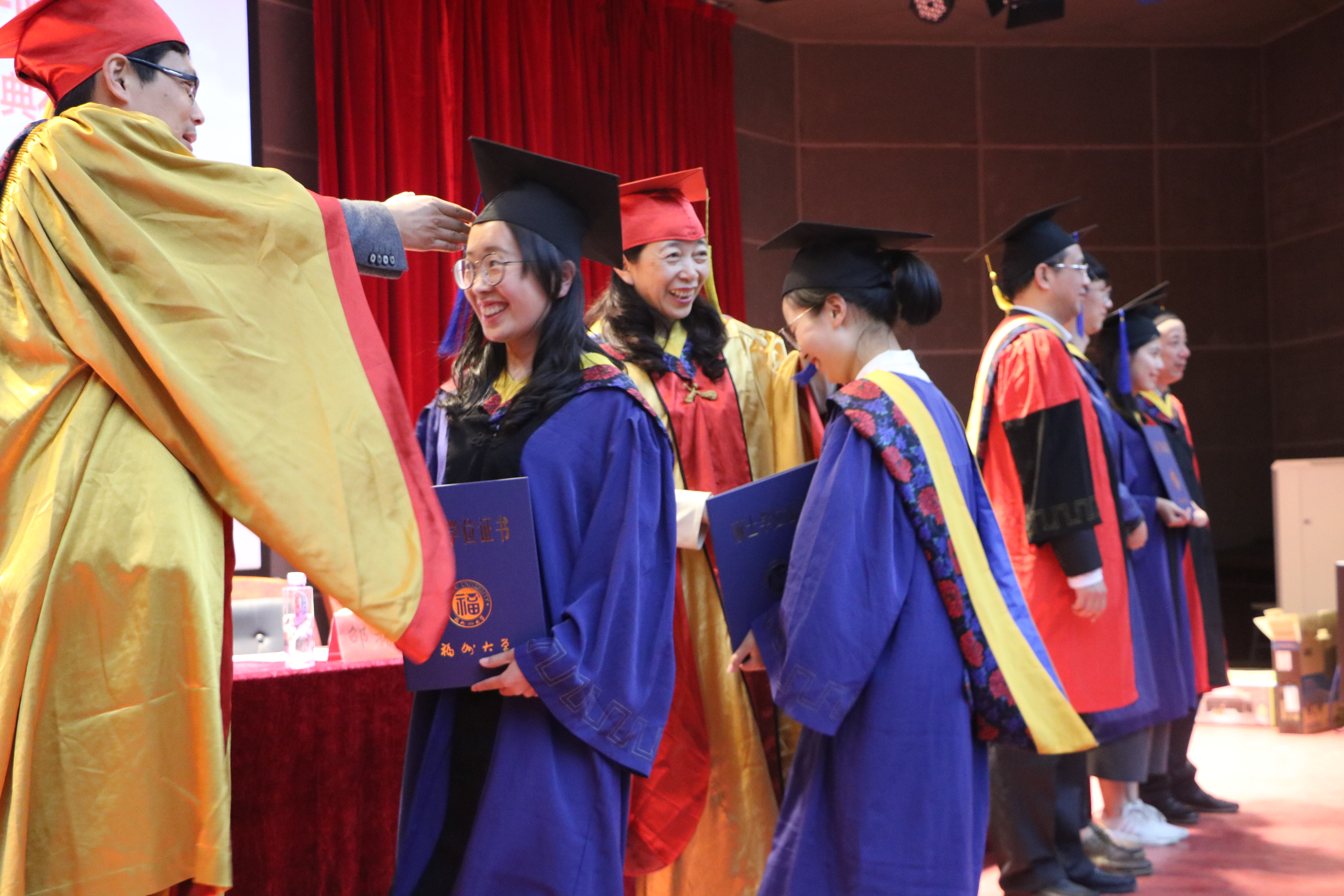 随后毕业生们依次走上主席台,学院领导为毕业生依次颁发学位证书,执拨穗礼,并与其一一合影留念。仪式在黄书记的祝福和《毕业歌》的旋律中圆满结束。