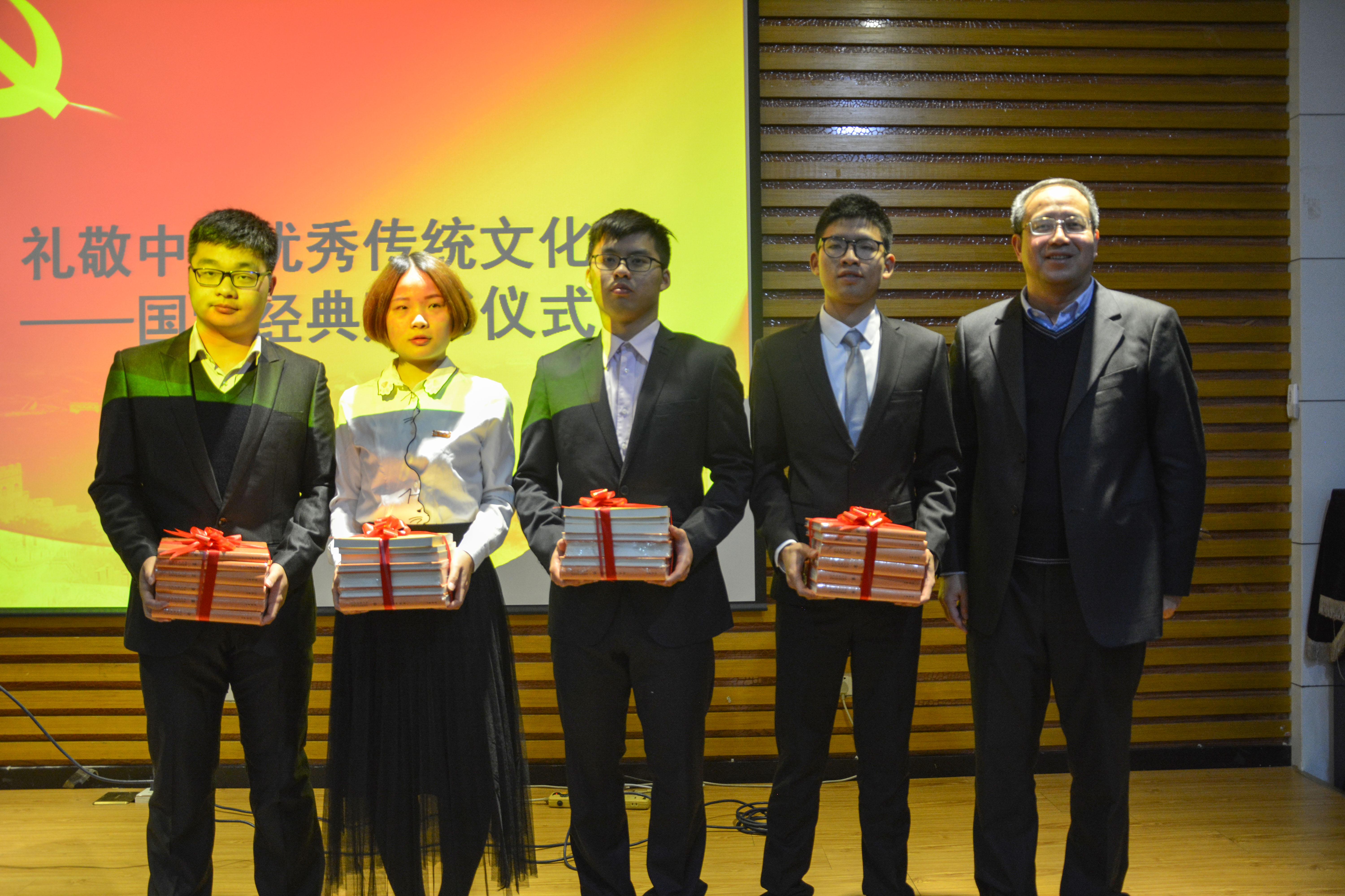 首先,四位年级主席依次上台领取赠书,在全场热烈的掌声中表达了他们对全民阅读经典的希望。随后,学生会主席李泽蓬同学上台宣读了倡议书。他认为读书可以开阔胸襟,阅读国学经典可以让我们博古通今,并且希望同学们可以“文明修身处世,践行传统文化”。最后,李泽蓬同学号召大家养成终身学习习惯,延续“与经典同行,与圣贤为友”的读书精神。