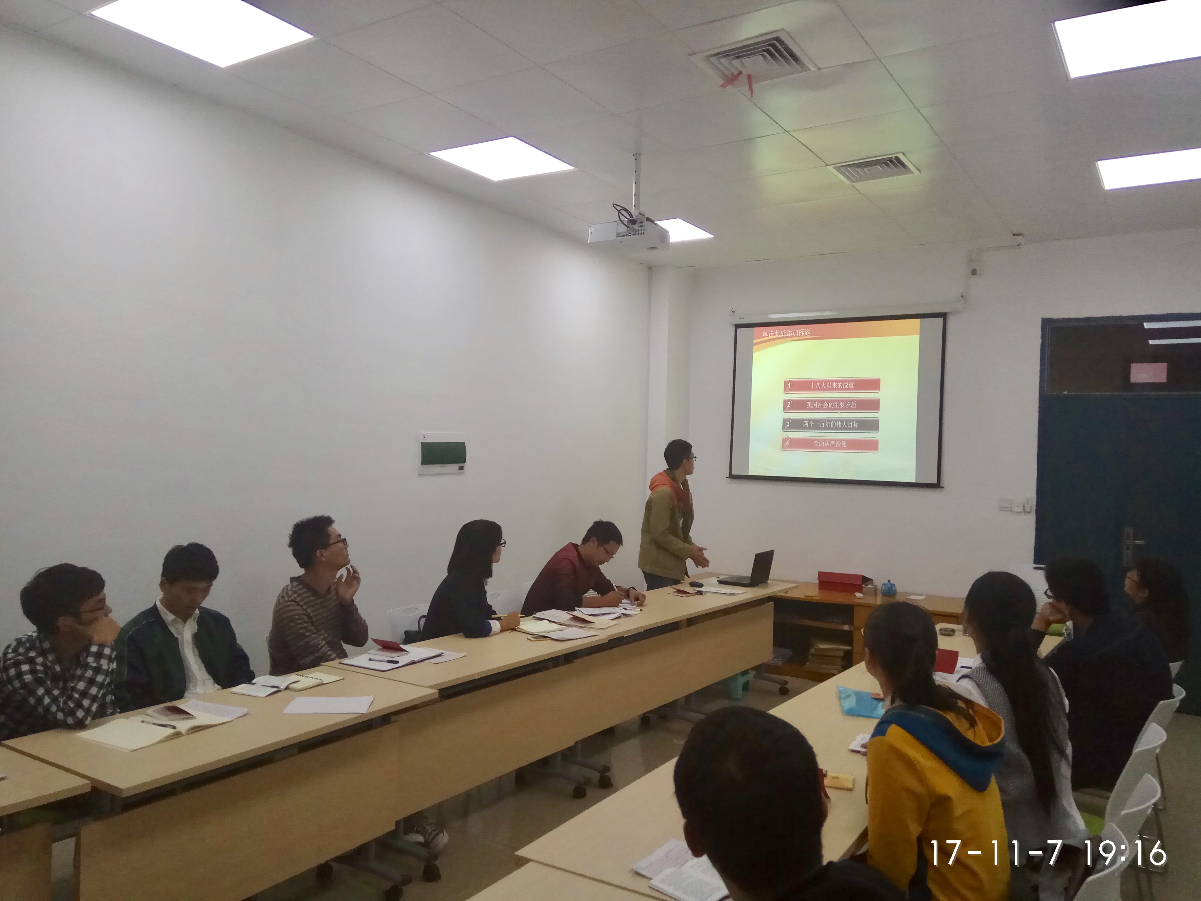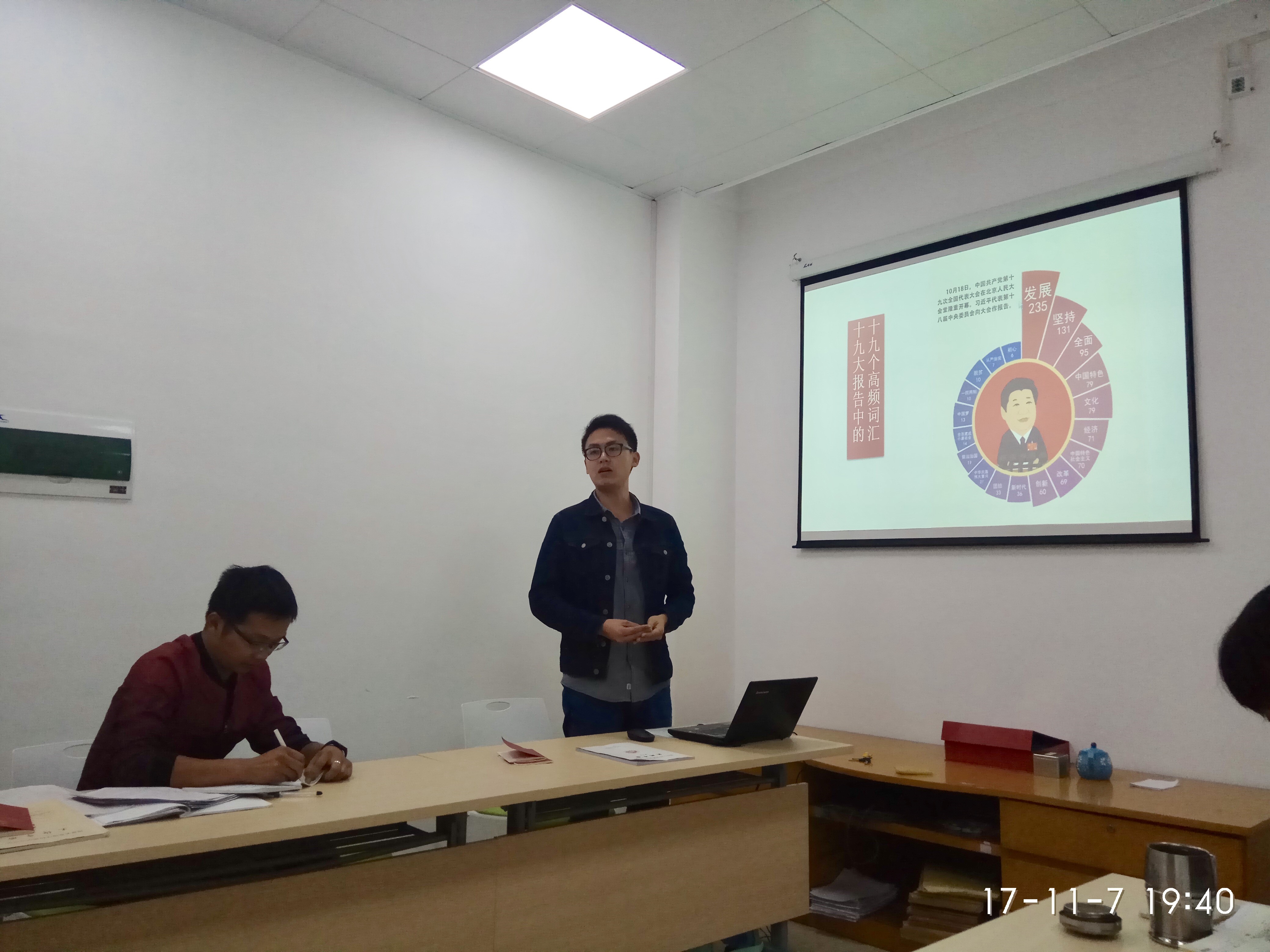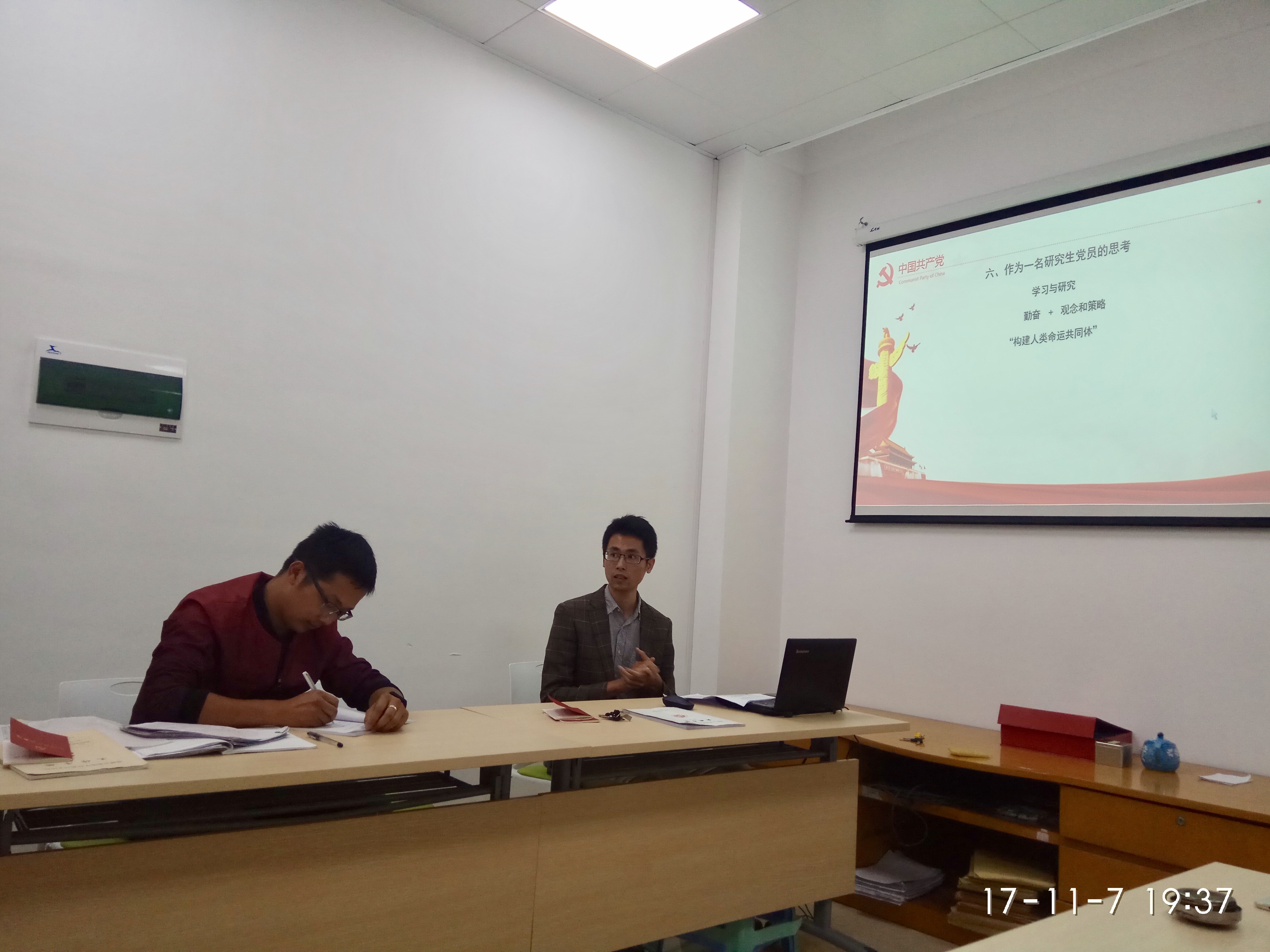 在交流中,谢仁栩同志讲解了题为“全面从严治党”的主题报告,他强调全面从严治党首先应加强纪律建设,必须把纪律挺在最前面,并指出党员应强化五种意识,争作遵章守纪的表率。然后黄晓权、邱星云、张倩、许连望等四位同志也根据自己对十九大精神的领悟做出了自己的讲解,主要内容包括:分析我国社会主义主要矛盾的转变,我国过去五年来取得成就的总结,构建人类命运共同体的应用延伸以及作为研究生党员应该如何实现“1+1>2”的思考等。