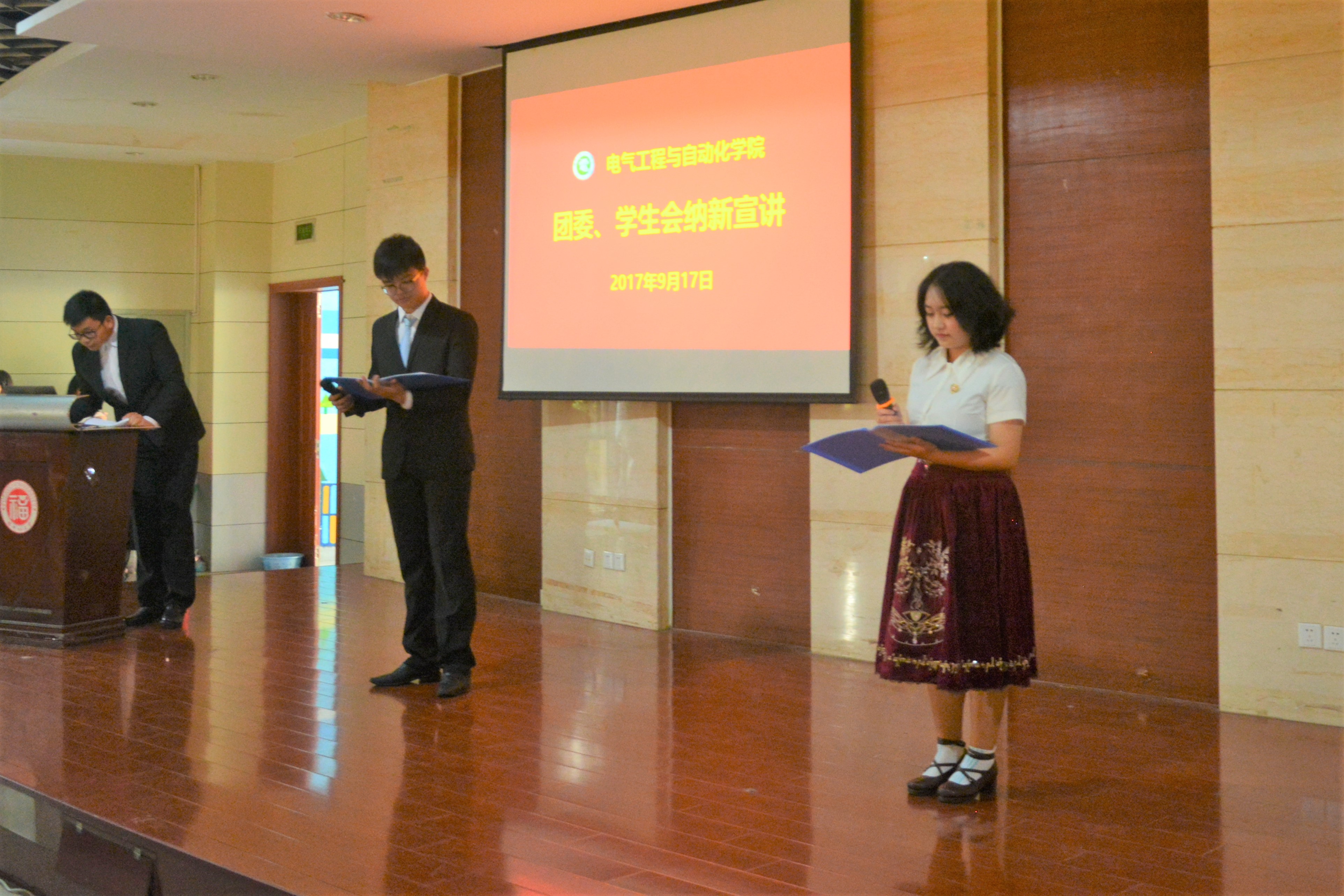宣讲会中,艺术团用精彩舞蹈和走秀博得新生们的欢呼,青年志愿者协会以原创freestyle引爆全场,学习部则是cos超级玛丽,为大家带来一帮妙趣横生的情景剧。科技部展示了各种酷炫的科技成果,吸引现场观众的眼球,秘书处派上两位端庄和帅气的部员进行宣讲,把秘书处小记者的认真、严谨和团结友爱的工作生活经历呈现出来。媒体宣传部则用精彩的视频和可爱的熊本熊压轴出场。