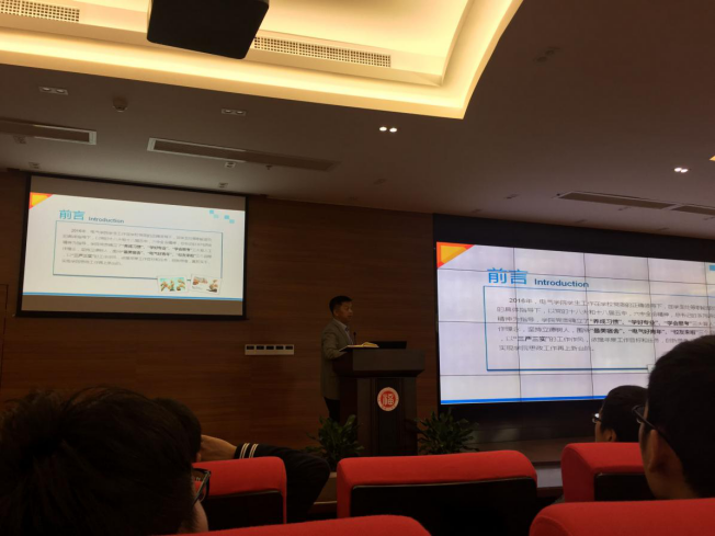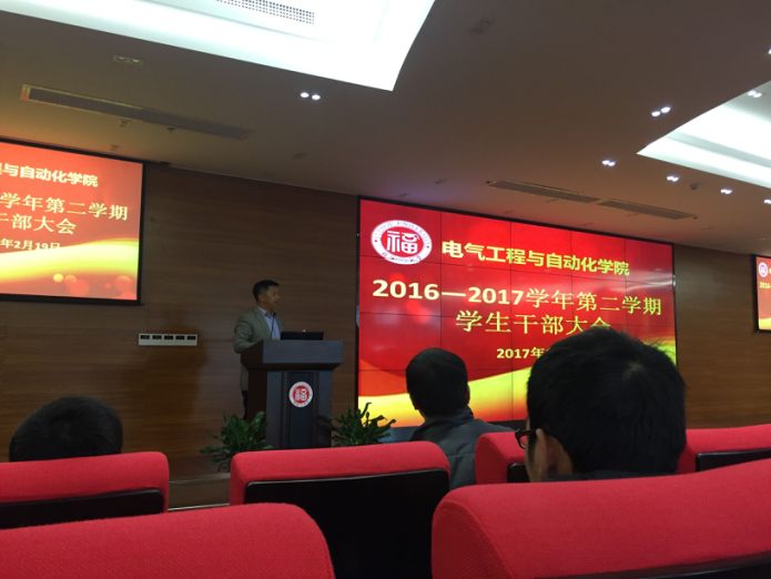 最后,黄国辉老师对学院2016年各项工作进行了总结、对学生干部提出了希望。他全面总结了去年学院学生工作:学院顺利拿下了“电力人才网络联盟”校园招聘基地这块牌子、成功承办了“第十一届全国电力人才就业论坛暨2017年毕业生供需信息交流会”,其他各项工作也稳中有进,这些成绩的取得都得力于学生干部的积极支持、努力工作。他希望学生干部在新的一年更要严于律己,树立为同学服务的宗旨,在学习与生活上管好自己的同时还要热心帮助同学,学会沟通、学会做人,真正起到先锋带头作用,在具有电气特色的创新创业赛事中更要积极参与、学以致用,力争取得好成绩。