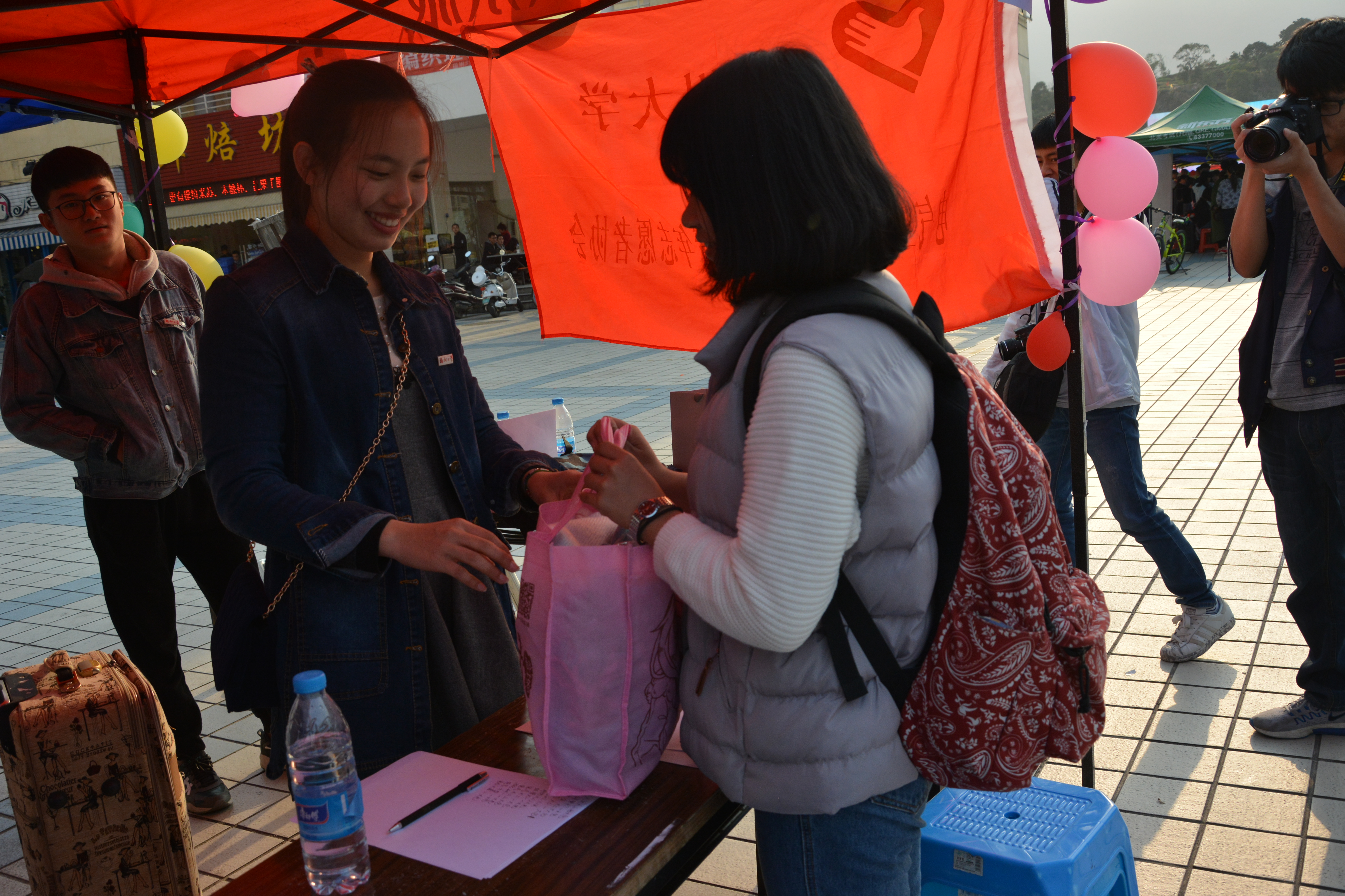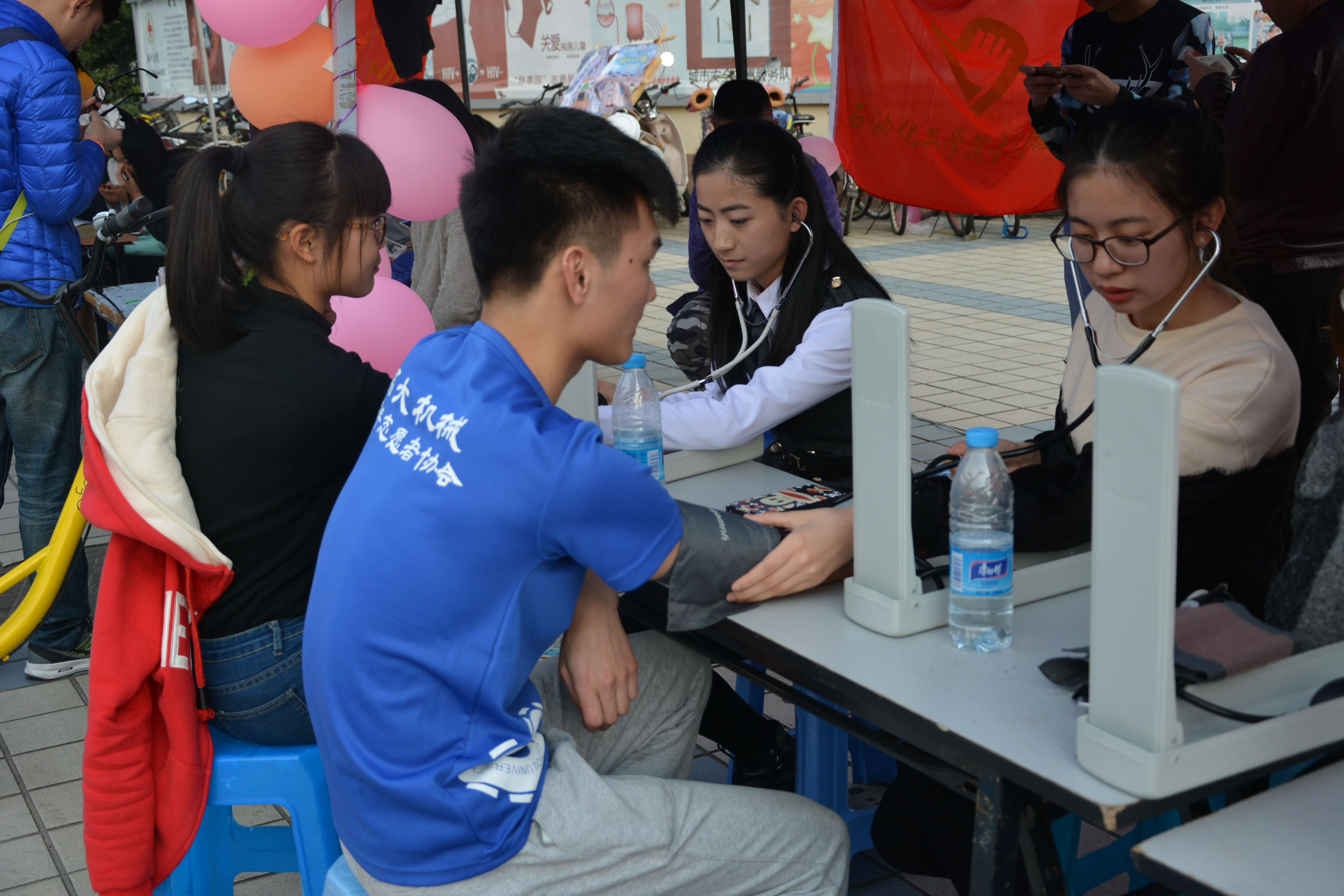 青协于当日在青春广场开展了回收旧衣物和义诊等活动。同学们将自己多余的衣服裤子等捐出来,为贫困山区的孩子们送去温暖。现场还有义诊活动,给同学们做测量血压等健康检查。
