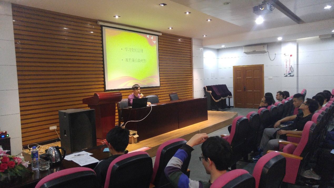 活动开始后,首先由韩腾飞同学向党员同志向党员们介绍党纪和党规,包括中国共产党廉洁自律准则规范和中国共产党纪律处分条例内与广大研究生密切相关的内容,并通过各地违法官员的典型事例,警示大家要把严守政治纪律和政治规矩永远排在首要位置,通过严肃政治纪律和政治规矩带动其他纪律严起来。接下来,与会党员一起观看了廉洁教育微电影《廉姻》,该电影以两个干部家庭的子女相爱结婚为背景,讲述一名基层税务局干部操办婚礼的波折故事,道出了党员干部要严格遵守八项规定、反对铺张浪费的廉洁要求。主人公最后的醒悟表明,只有以身作则,遵守相关规定,才能守住党员干部的底线,过上踏实安心的生活。