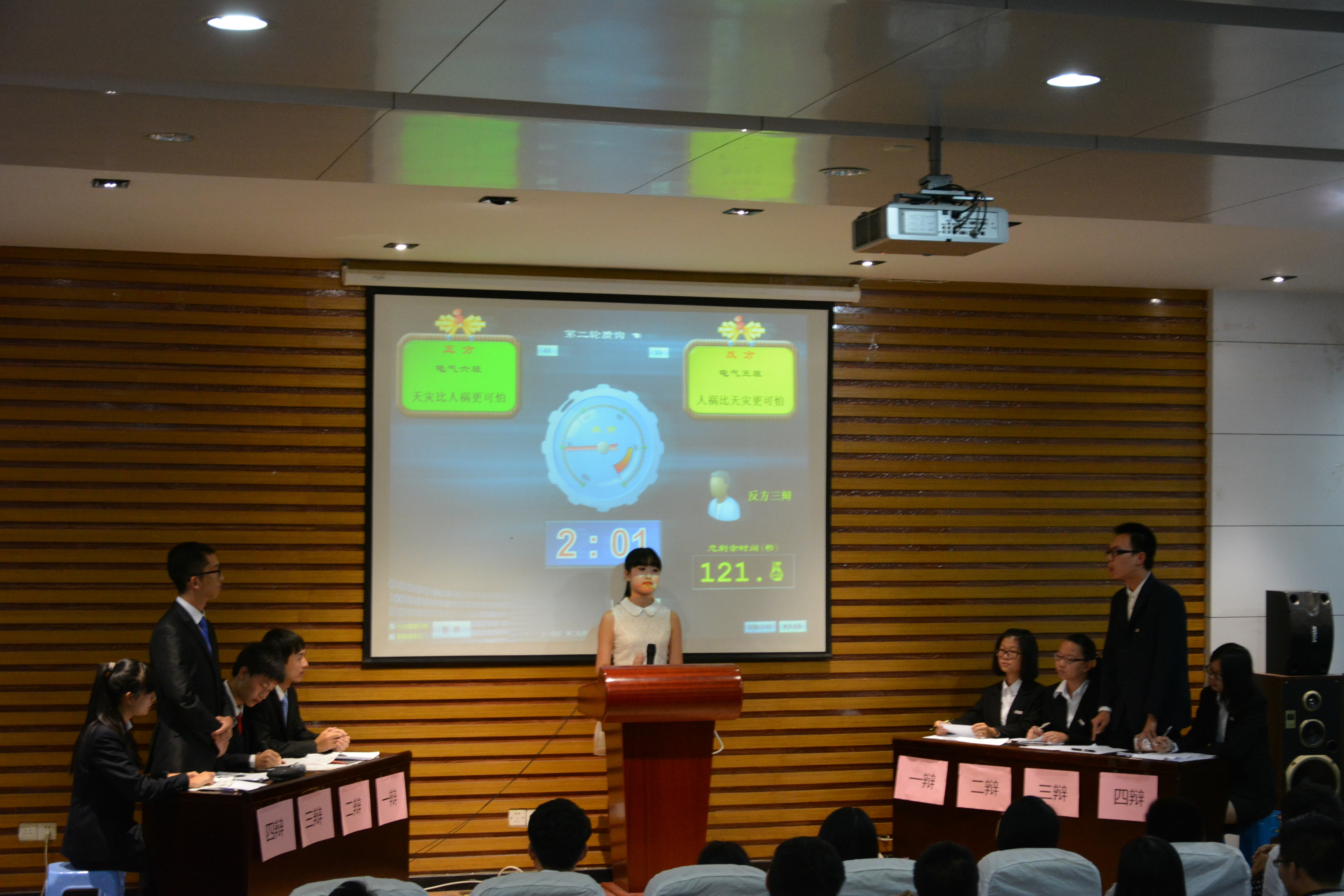 辩论队承办,比赛以“天灾与人祸哪个更可怕”为辩题。出席本次比赛的嘉宾评委有辅导员段小华,学生会主席邱陵腾,团委副书记祝文熹,副主席潘嘉辉、翁嘉晨、林泽鸿、曾泽宇等,并特别邀请了生工学院、人文学院与外院的辩论队队长担任评委。