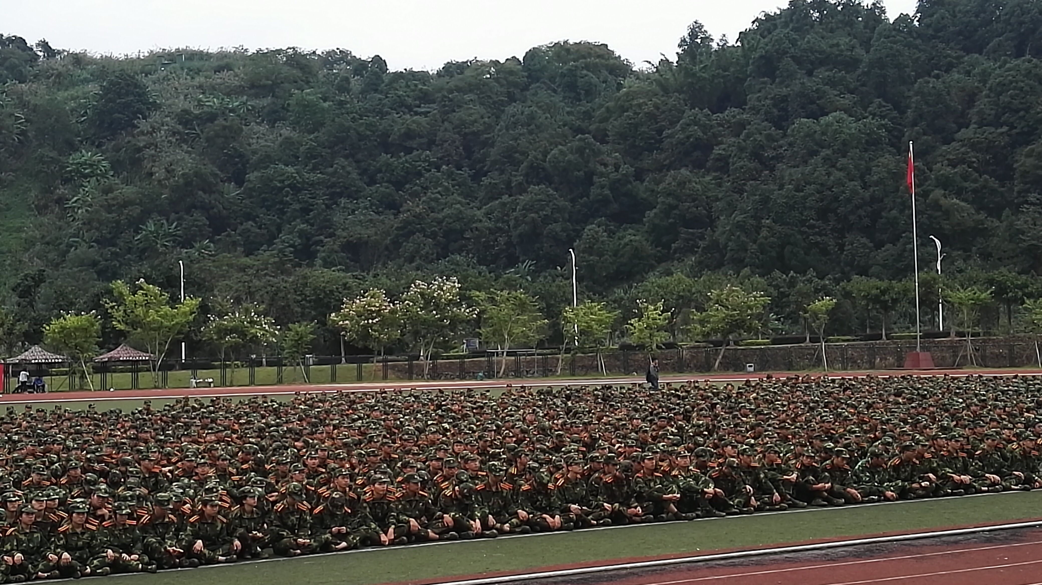 大会结束后,新生们以学院和班级为单位合影留恋,大家呆在绿茵场上,自由地拍照,狂欢,久久不愿离去。教官们早早地就回宿舍去了,没来得及让大家说声道别,只能留给大学军训记忆中的点点滴滴。“流汗流血不流泪,掉皮掉肉不掉队”,教官们言传身教,将吃苦精神、无畏精神和国防意识教给同学们,同学们也在这十四天里严格要求自己,积极参训,不论结果如何,大学军训都将成为人生中一段散发光辉的记忆。