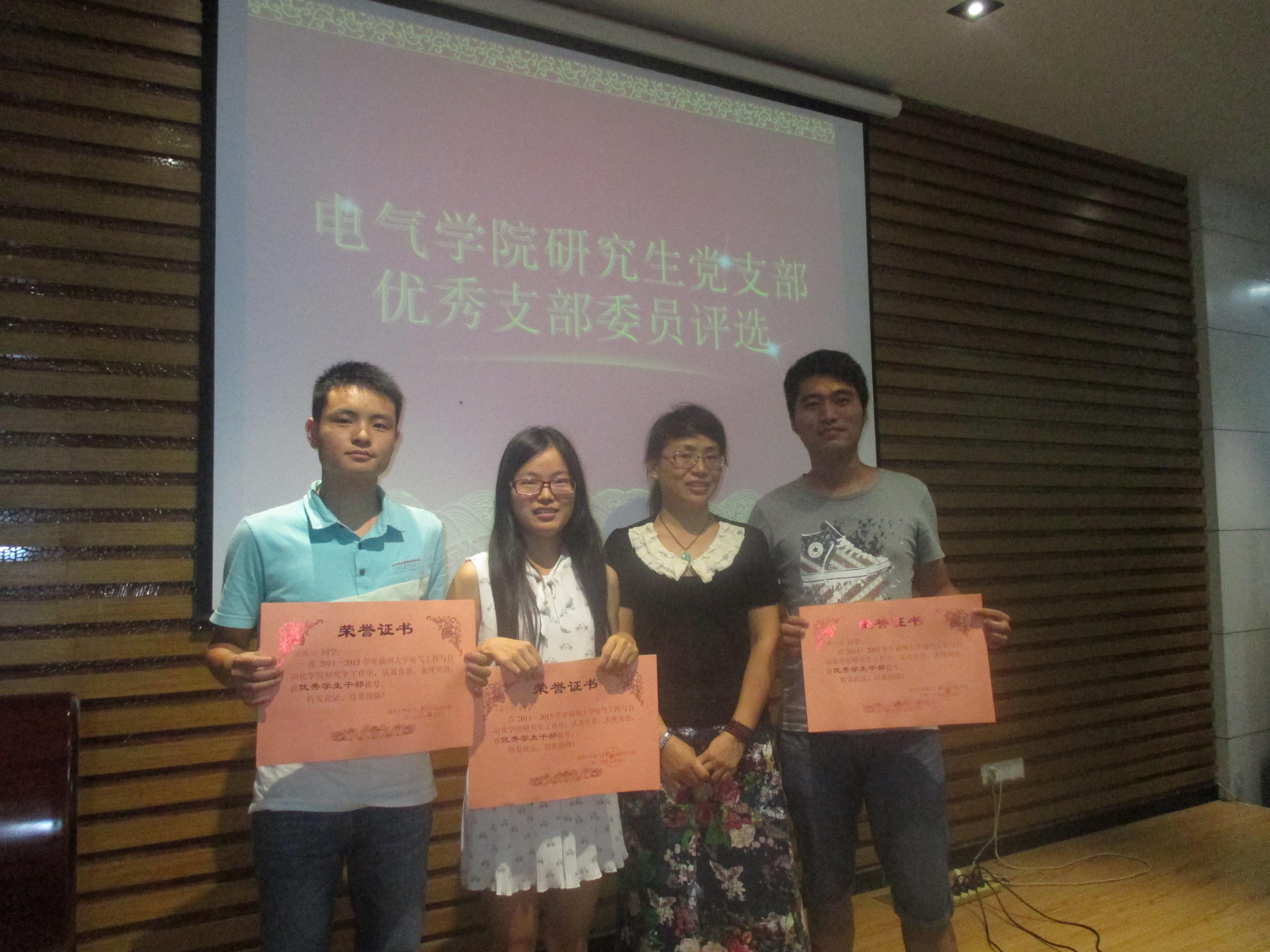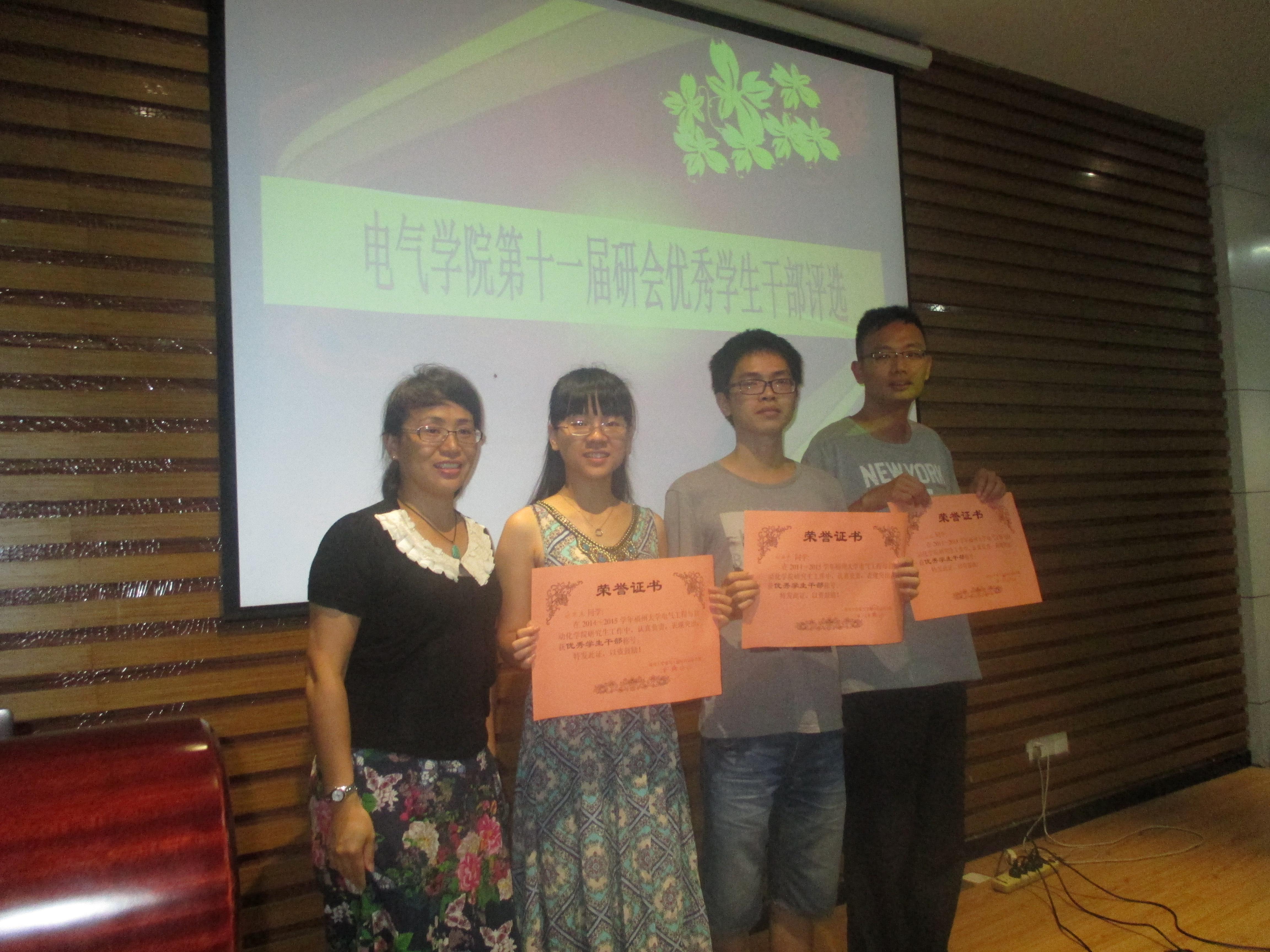 最后,许海燕老师对研究生会和研究生党支部一年来的工作进行了简单点评,并对新一任干部提出几点要求,希望以这次优秀干部评选活动为契机,互相活动,认真总结,争取下一年度研究生工作取得更大成绩。最后,许老师为获奖干部进行颁奖,并合影留念。此次活动不仅是优秀研究生干部的评选活动,更是一场新老研究生干部的经验交流会。