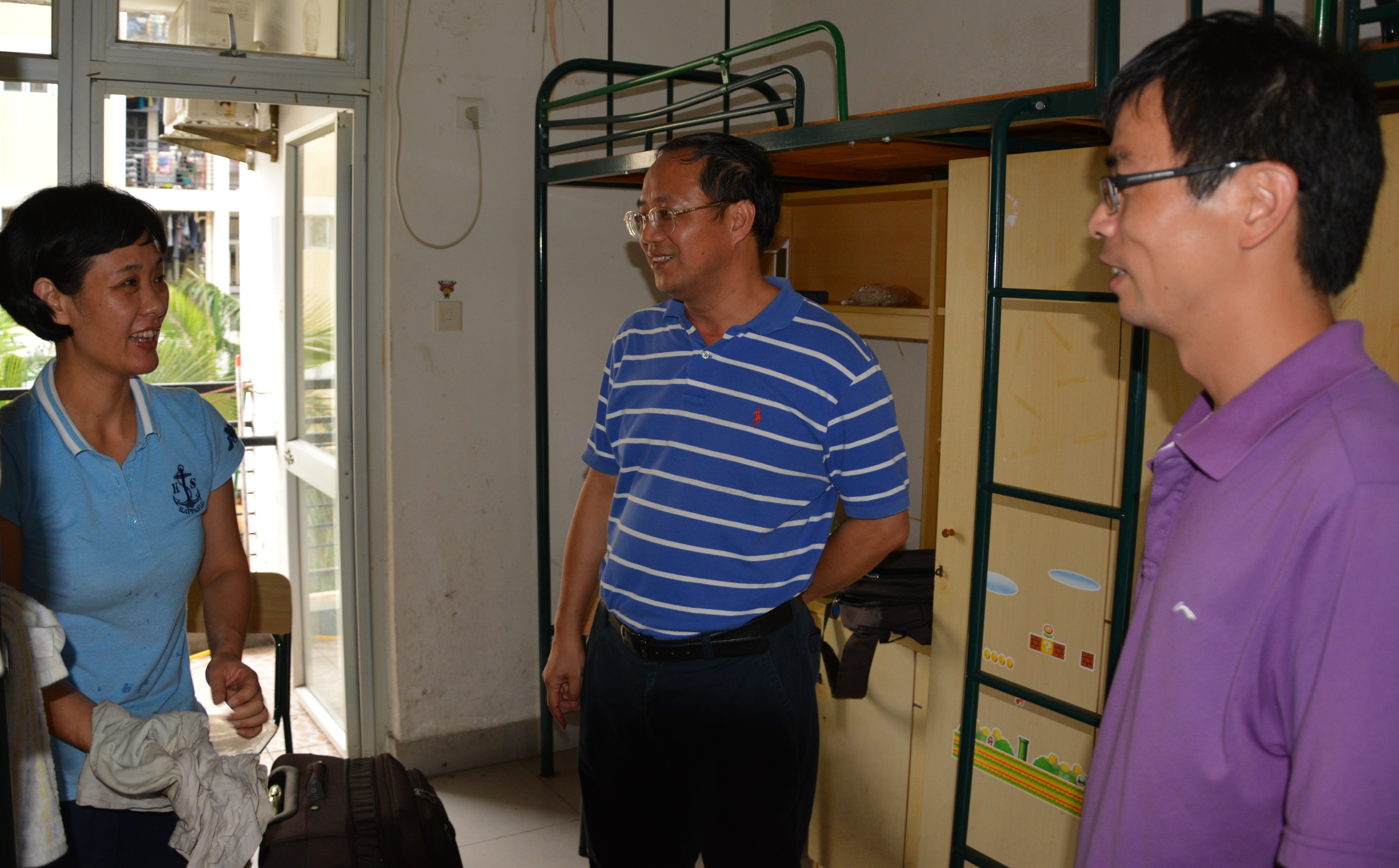 何书记首先听取了院团委书记张志雄老师的迎新筹备工作汇报,并对工作中可能出现的问题提出了中肯的改进意见。接着,学院领导走访了新生宿舍,详细检查了新生宿舍清洁工作是否到位,并与提前到校的新生及其家长进行了亲切的交流。何书记关切地询问新生是否适应以及宿舍存在的问题等等。看到学生公寓的部分家具门窗已经损坏,何书记要求院团委以及学生干部及时做好统一报修工作。