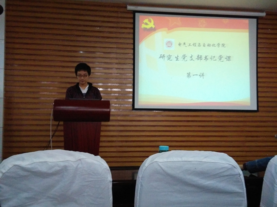 此次党课由电气工程研究生第一党支部书记钱佳琦和副书记吴瑾樱主讲。辅导员许海燕老师、电气工程研究生第一党支部全体党员以及全院研究生入党积极分子和发展对象参加了这次党课学习。首先,钱佳琦同学结合“爱国主义教育、敬业程度调查、学术诚信和扶人被讹”这些热点时事对社会主义核心价值观的个人层面——“爱国、敬业、诚信、友善”这四个内容进行了分点讲述。吴瑾樱同学通过对历史英雄人物和当代茅以升、袁隆平等焦点人物的事迹讲解,引出我国“中国梦”的伟大构想,激励研究生努力实现个人梦想,并进而编织成中华民族伟大的“中国梦”。党课采用理论联系实际的方式,并穿插有精彩的小视频,思路清晰,内容丰富,授课效果良好。