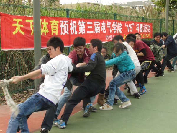 2点30分,“V5”杯运动会的第一项活动——宿舍篮球赛准时开始了。春季的阳光洒在朝气蓬勃的同学们身上,映衬着他们矫健的身姿。场下的同学们时不时为一个精彩的上篮动作或是优美的投球姿势欢呼喝彩。该运动会还为女生们“私人定制”了女生投篮的运动项目。在热心的男生的帮助下,投篮的女生们成为篮球场上一道亮丽的风景线。而进一步展现“V5杯”运动会魅力的是夹球接力跑和拔河比赛。比赛中队员们的互相调侃让场面显得更加和谐。