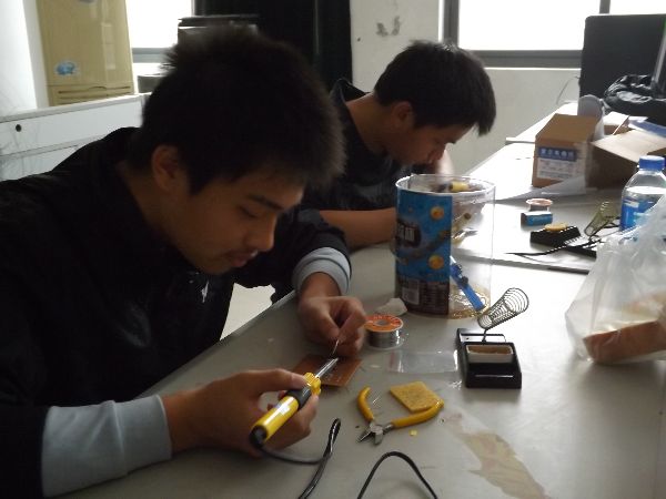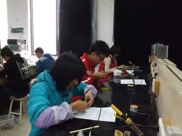 上午9点整,焊接大赛准时开赛。工作人员发下电路元件和电路图后,参赛选手就投入了紧张而不失细致的焊接比赛中。排布元件、固定元件、连接焊点……一步步做下来,容不得半点马虎。比赛时间一点点流逝,35分钟过去后开始陆续有参赛选手进行最后的测试过程并上交自己的精心之作。此时,对于仍然处于紧张焊接中的选手来说无疑是巨大的心理考验:其他选手已经面带轻松走出赛场,而自己却还缺少一些步骤,但是却不能有一丝慌乱,直至自己也成功交上作品。继上午紧张的赛事,下午的焊接比赛同样进行得如火如荼。最后,七班王仁康、三班乐天达技压群雄,一举拿下得本届焊接大赛一等奖。