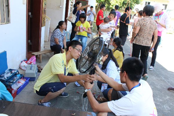 带队张志雄老师介绍,今年社会实践活动的一个亮点是‘点面结合,服务到家’。具体来说是首先针对居住偏远的村民电器维修不方便这一状况,实践队一方面集中设点接待村民,另一方面入村入户,上门服务。其次针对家长暑期疏于监管留守儿童及学龄儿童,实践队成员设立安全知识第二课堂,为小朋友进行安全知识讲解。