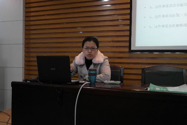 讲座分别围绕新闻写稿、新闻摄影和人物专访三方面展开。针对记者团的部员在执行这些任务时应该注意的事项及容易出现的问题,陈荟芳老师结合所学和切身经验进行了较深刻的讲解。特别是在新闻写稿方面,陈老师提出了“需要有时代背景融入”、“内容主次要有所侧重”等观点,并要求校园记者写稿需要严格按照“采、编、写、改”的四步骤来完成,着重强调了事先搜索资料的重要性。最后,陈老师鼓励记者团新部员们多阅读各种优秀刊物的稿件和照片,工作中要投入一定的兴趣和养成深入学习的态度,学会向优秀的老部员们学习,在学习中成长,在实践中沉淀。