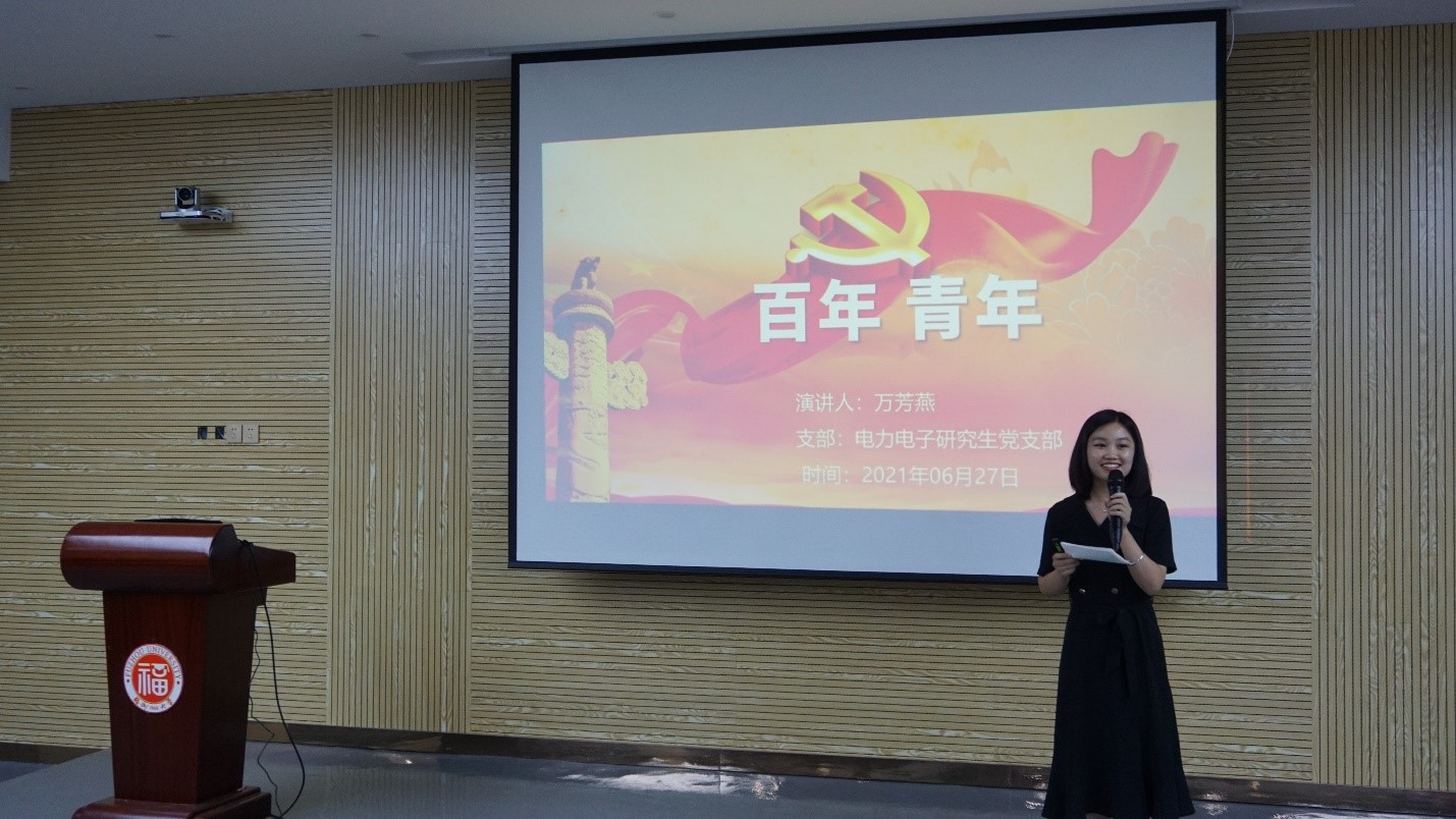 首位进行微党课展示的是电力电子研究生党支部书记万芳燕,她的微党课主题是《百年 青年》。万芳燕同志提到,从红丝带到井冈山精神,从防护服上的标语到伟大抗疫精神,无一不彰显了中国青年的担当和奉献,并以此呼吁青年为早日实现“碳达峰,碳中和”目标奉献青春力量。
