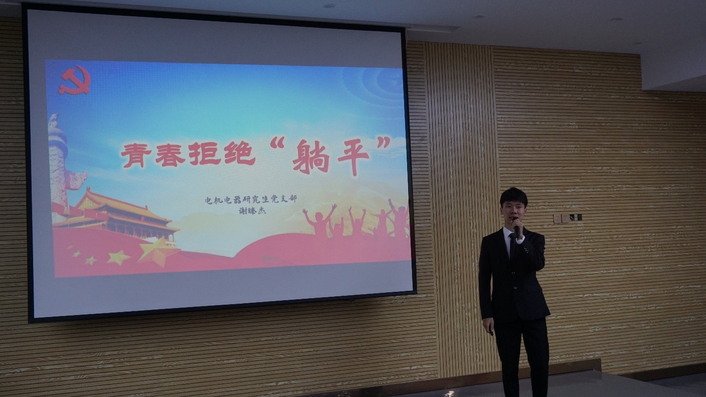 第四位出场的是电机电器研究生党支部书记谢臻杰,他带来的微党课是《青春拒绝“躺平”》。谢臻杰同志号召党员拒绝网络上“躺平”的风气,坚定远大理想,勇挑时代重担,坚持知行合一,牢记正妹av