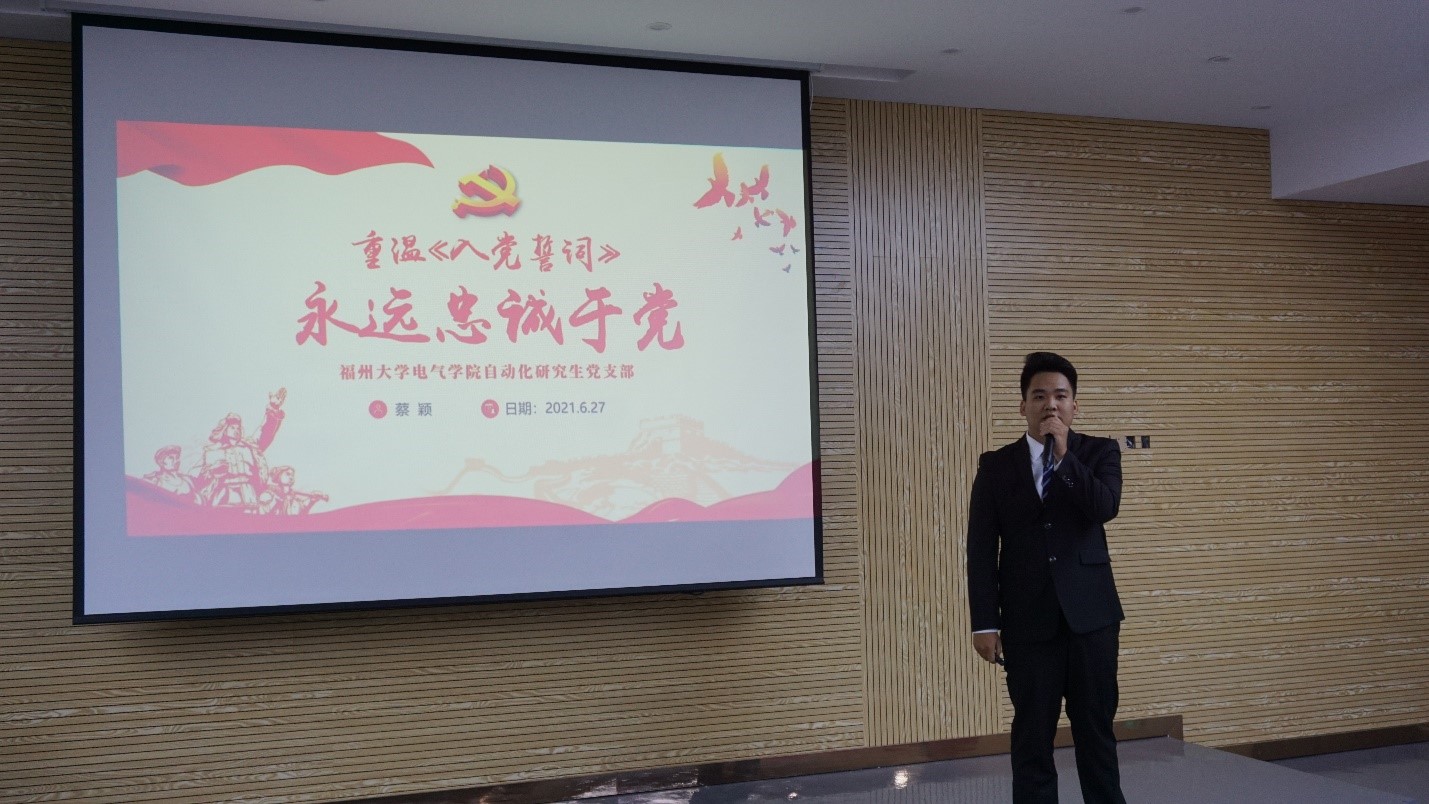 最后出场的是自动化研究生党支部书记蔡颖,他的微党课题目是《重温入党誓词,永远忠诚于党》,蔡颖同志通过重温建党百年来不同时期入党誓词的文字表述,梳理了入党誓词中的历史脉络,倡导新时代研究生党员时刻牢记入党誓词,用一生去坚守、用生命去捍卫这份对党和人民的庄严承诺。