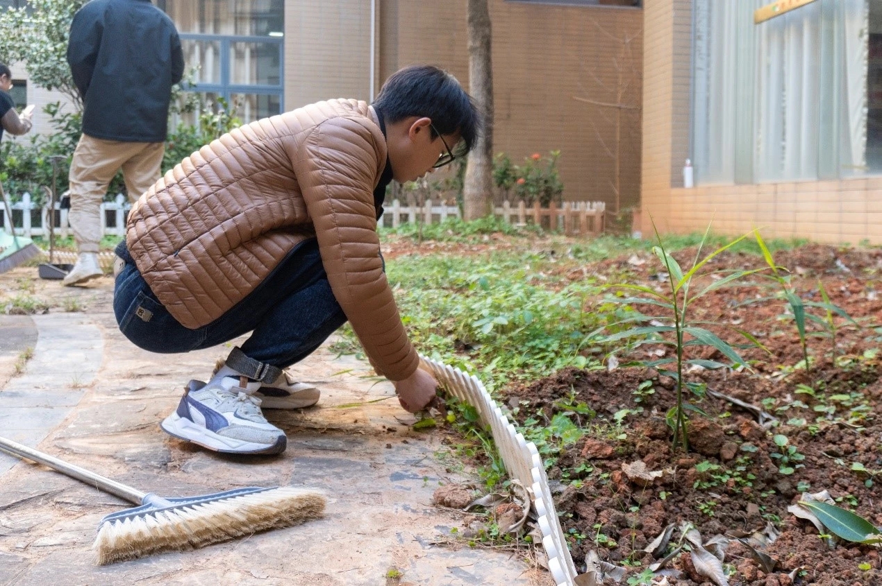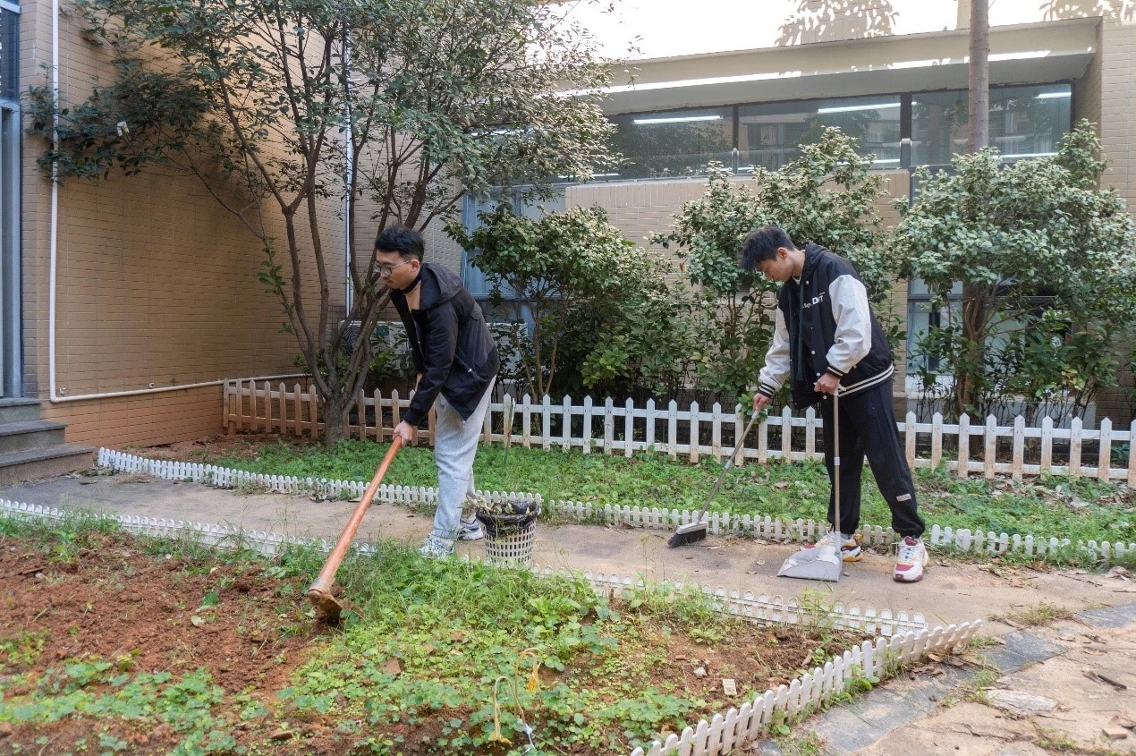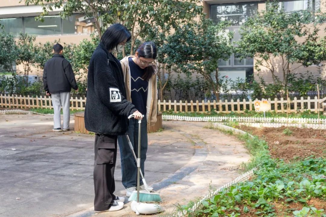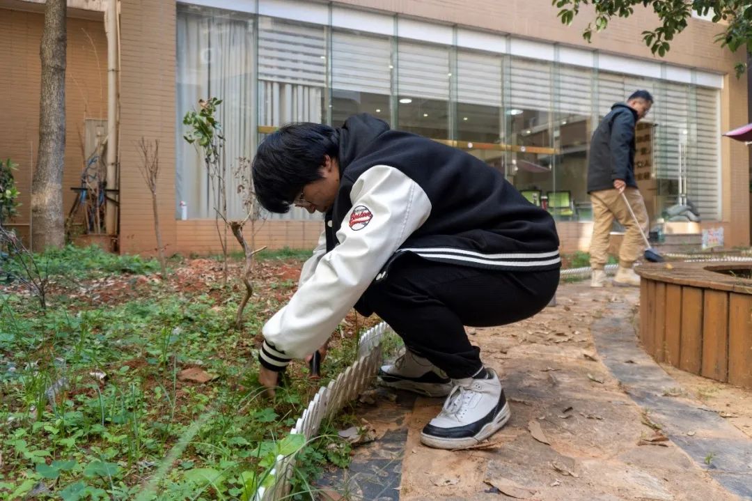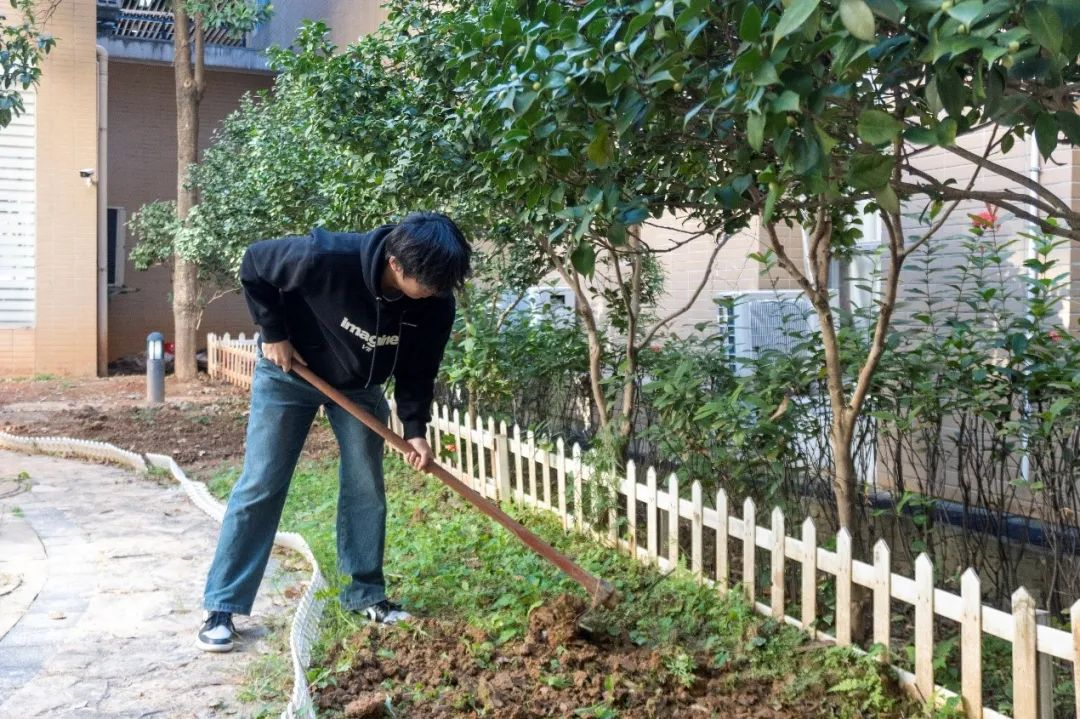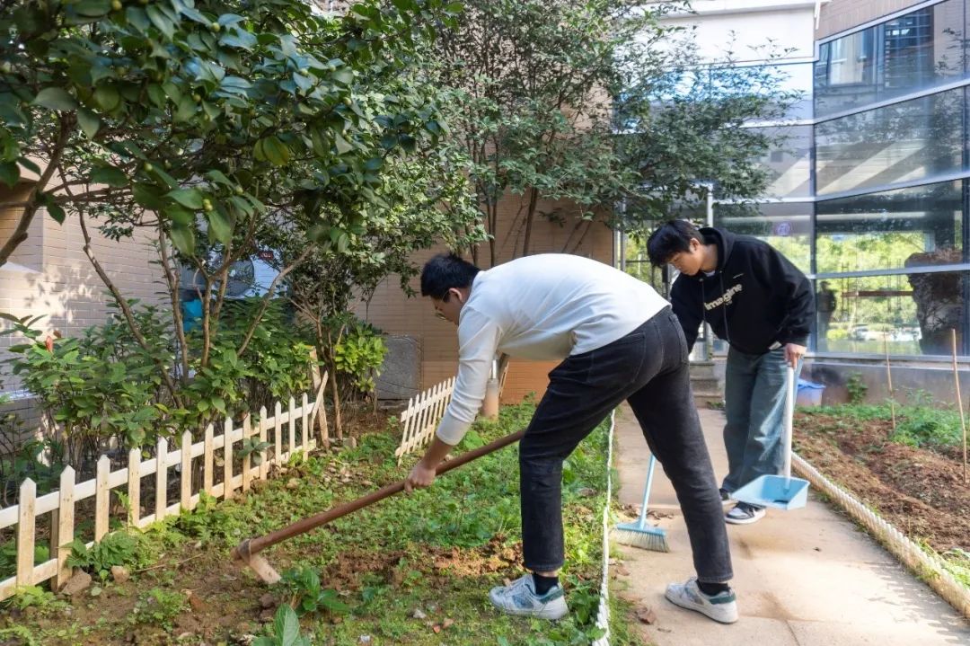 在活动开始前,大家准备了手套、铁锹、铁镐等工具,以确保活动的顺利进行。劳动现场,同学们全身心地投入其中,展现出了极高的热情和参与度,有的同学打扫落叶,有的同学清除杂草,有的同学耕锄土地,有的同学灌溉植物……大家共同为这片土地付出努力,体验了劳动的乐趣和收获的喜悦。