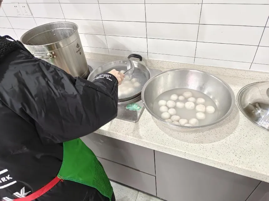 接下来的步骤是煮制。在这一环节中,我们需要特别注意,因为元宵和汤圆的馅料有所不同,包有肉馅的元宵需要煮得久一些以确保熟透。为了确保元宵和汤圆都能得到适当的煮制,师傅建议我们将它们分开煮。他提供了详细的指导,包括煮制的时间、火候的掌握以及如何判断熟度等。在师傅的指导下,同学们亲手完成了这个步骤,不仅学会了如何煮制元宵和汤圆,也体验到了传统美食制作的乐趣。