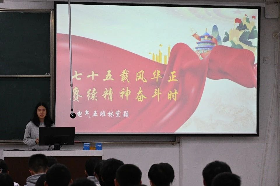 在主持人介绍活动背景和比赛规则后,一号选手张小柯从四个方面展开团课讲解,明确了共青团员们应在政治思想上同党中央保持高度一致,呼吁电气青年们踔厉奋发,笃行不怠,一同建设未来风华。
