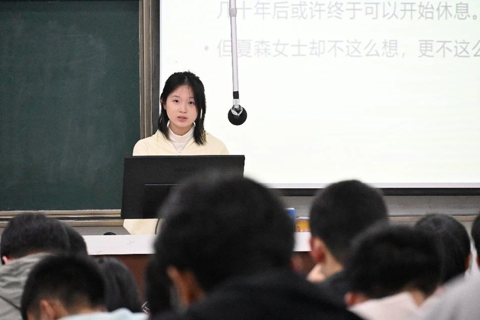 六号选手王心琳以夏森女士为范例介绍了新时代之楷模,为我们青年指引了方向,呼吁团员青年们向夏森女士学习,将甘于奉献的美好品质与砥砺深耕的不朽精神一代代传承下去。