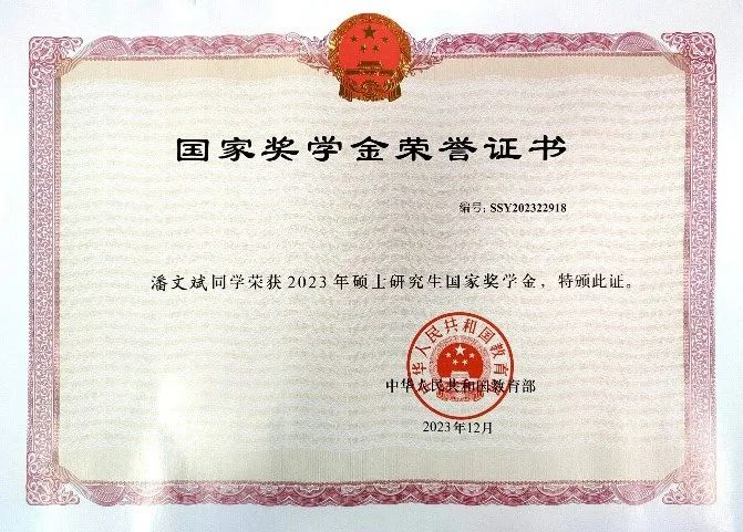 优秀学生干部称号、研究生国家奖学金、研究生中期学业奖学金、助研奖学金等荣誉。
