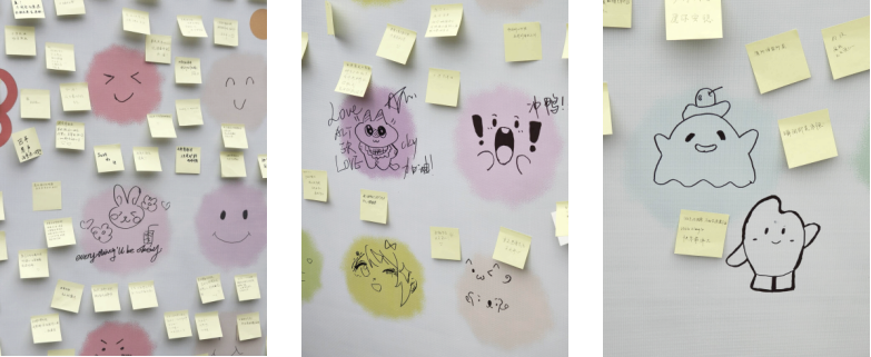 参与者在卡片上写下自己身边温暖、治愈的故事或一段鼓励他人的话语,将卡片挂在展板上。随后,在卡片旁绘制一张彩色笑脸,传递正能量。完成这两个环节后,即可领取一枝象征着纯洁与和平的白玫瑰作为回馈。用文字、色彩和花朵,共同创造一个充满正能量和美好祝愿的空间。