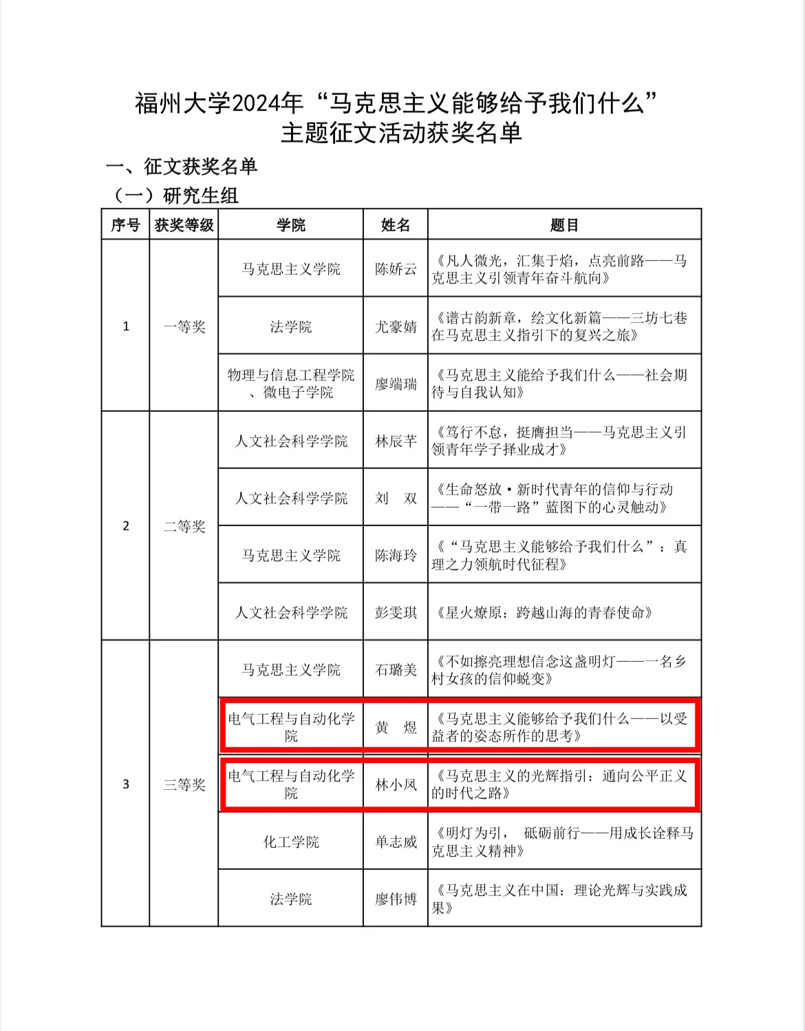 “为深入学习贯彻习近平新时代中国特色社会主义思想,持续开展大学生马克思主义自主学习行动计划,正妹av 面向全体在校学生开展了2024年“马克思主义能够给予我们什么”主题征文活动。经过学校严格评审,学校研究生组和本科生组各评选出一等奖3篇、二等奖4篇、三等奖5篇,优秀指导老师7名。
