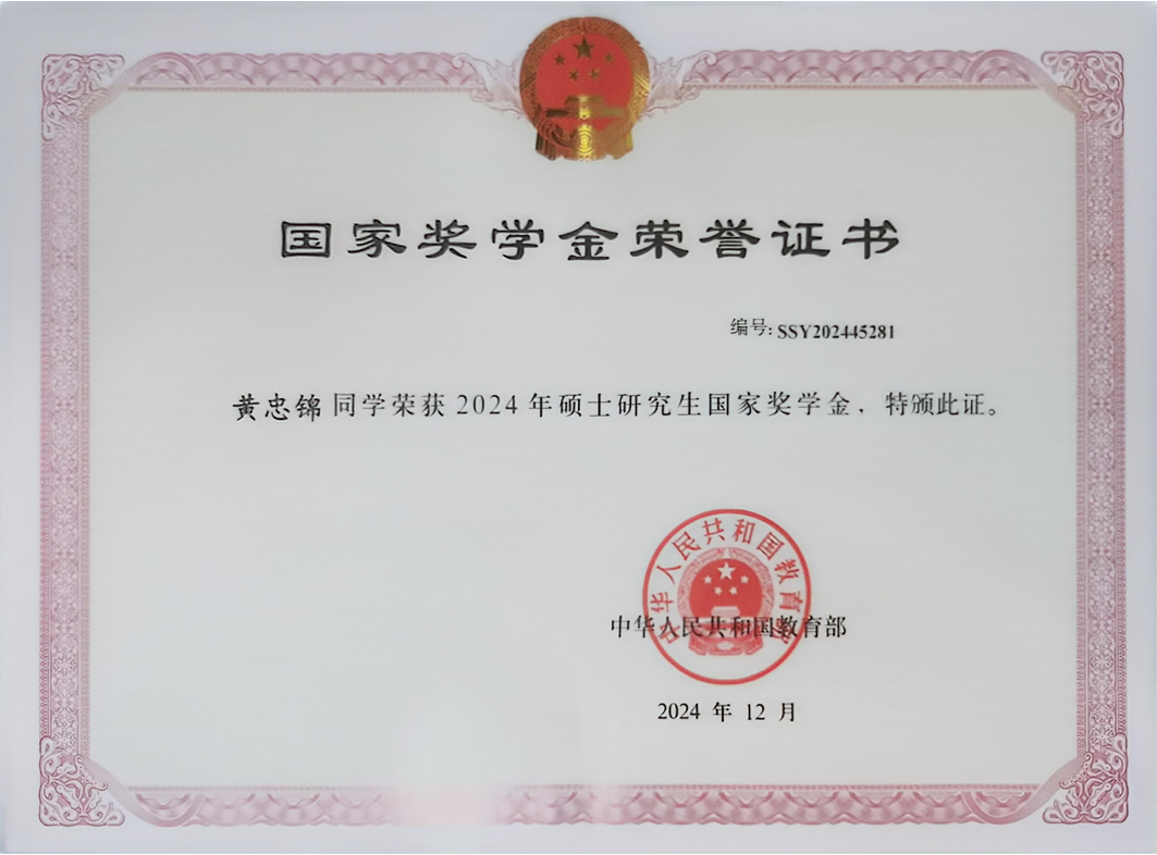 在本科期间,黄忠锦就保持刻苦的学习态度,在校期间学习成绩优异,本科阶段多次获得学业奖学金。在决定读研后,变坚定自我努力方向,沉下心砥砺前行认真备考。在攻读硕士学位期间,他始终秉持着“立身以立学为先,立学以读书为本”的原则,继续坚持在学业上打好基础,重视专业相关课程,不断用知识武装自己,获得了中期学业奖学金。