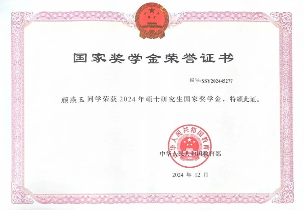 硕士研究生优秀新生一等奖学金、中期优秀学业二等奖学金、两次研究生助研奖学金。