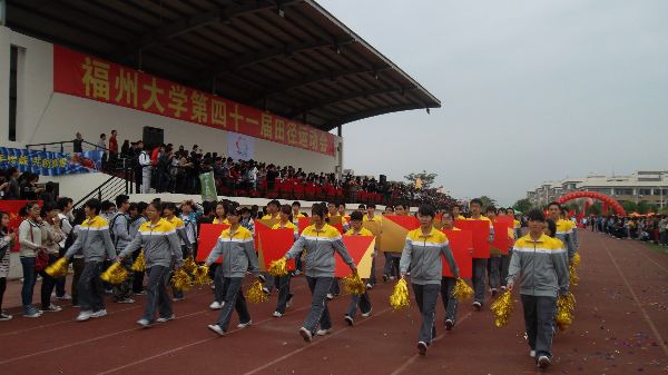 在洪亮的运动员进行曲中,在现场观众的急切期盼中,国旗队、会徽队、花束队和彩旗队率先进入了田径场。国旗队员们那坚挺的身姿,整齐的步伐, 昂扬的气质,在一瞬间就吸引了在场观众的眼球,将现场的气氛推入了高潮。接下来的是各个学院代表方阵入场。各个学院尽展其能,将学院特色与文艺表演充分结 合,给我们展现了别具一格的风采。不论是电气学子们激情洋溢的红旗阵和“源生福大,电耀中华”的铿锵决心,还是人文社科学院的优美舞姿和动感十足的“红花 阵”,还是阳光学院挂帆破浪起航的“阳光号”,都赢得了现场领导老师和观众的热烈掌声。健美操队的青春活力更为开幕式画上浓墨重彩的一笔。