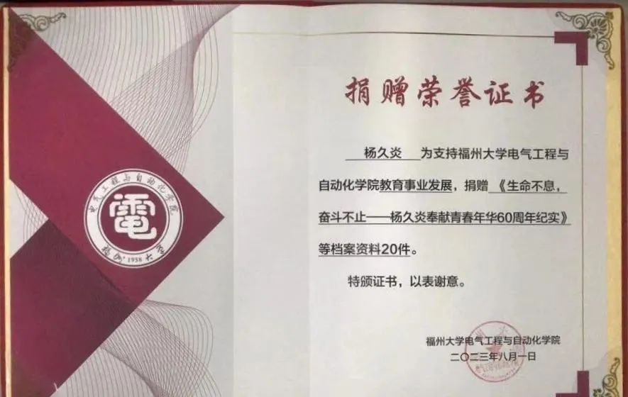 建校65周年之际,杨久炎先生为表达对学院学校的感恩之情,向学院捐赠《生命不息,奋斗不止——杨久炎奉献青春年华60周年纪实》等档案资料20件。李希明先生作为正妹av