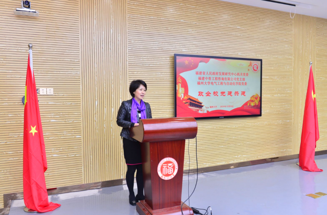 福建省人民政府发展研究中心机关党委专职副书记邵长钗对此次“政企校”三方党建共建的背景、合作情况作了一个总结发言。他说,今天刚好是毛主席诞辰127周年的纪念日,在这个日子举行“政企校”党建共建更显意义特殊。党的十八大以来,以习近平同志为核心的党中央着眼于推进中国特色社会主义伟大事业和党的建设新的伟大工程。为深入贯彻习近平新时代中国特色社会主义思想,探索党建工作新机制,我们三方本着“优势互补、合作共赢”的原则,推进“政企校”三方共建,真抓实干,推动科研力量优化配置和资源共享,支持地方建设,推动企业创新活动。在共建活动中,要增强“四个意识",坚定“四个自信”,做到“两个维护",充分发挥党建引领的作用。