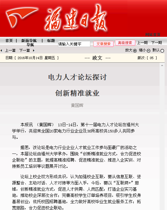 该论坛此前已成功举办了十届,在推动电力人才就业工作及校企深层次合作上发挥了很大的作用。今年也是首次在福建举办,是电力行业企业人才就业工作参与面最广的活动之一,共迎来了20家电力行业企业及36所高校共150多人共同参与。论坛上,校企双方进行了直接对话,成功有效的进行了沟通,就电力人才就业工作面临的新形势、新问题以及好的做法经验进行了深入的交流,并就如何创新精准就业方式,合力促进校企联动进行了讨论。校企双方形成共识,认为加强校企互联,要从信息互联、资源整合、主动对话、人才对接等方面入手,今后,要以“互联网+”思维,创新精准就业方式,促进人才供需、人岗匹配;打造企业实习基地,推动校企深层次合作;完善高校学生订单培养项目,吸引学生投身基层创业;依托校园招聘基地,全力做好高校毕业生就业服务工作;拓宽思路,合力促进校企联动。