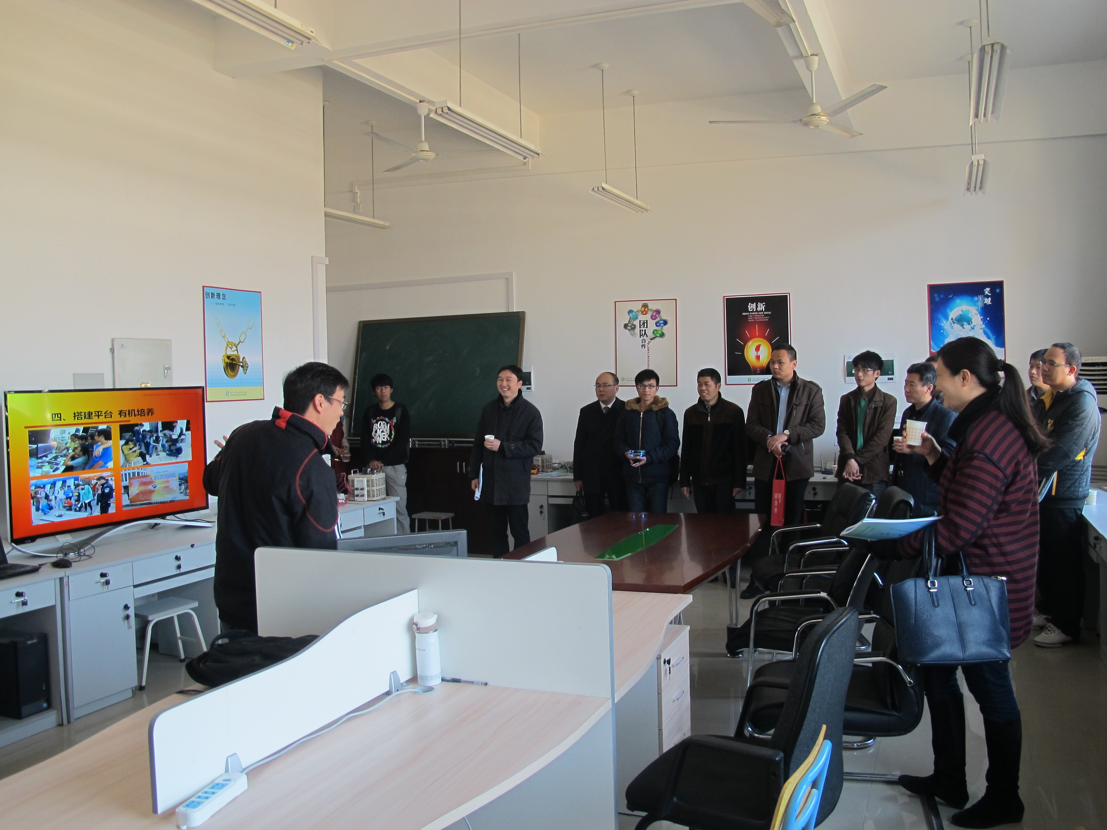 检查学生专业创新创业实验室建设情况,张志雄、陈建国、沈庆斌等老师陪同检查并就实验室的建设情况做了讲解。