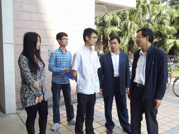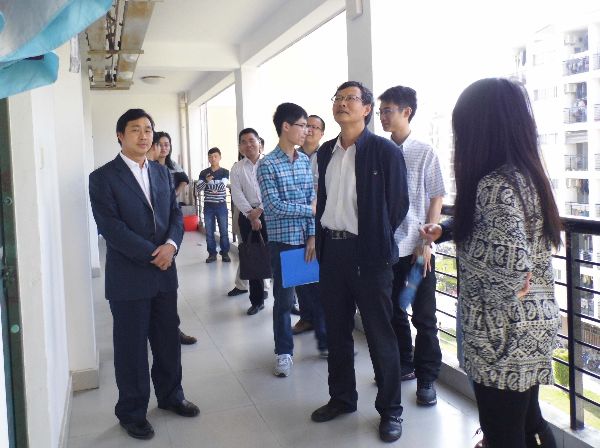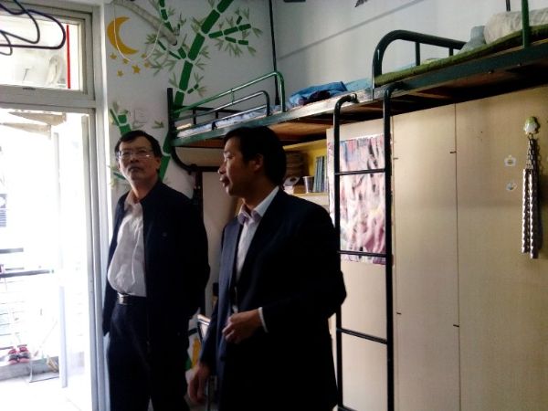 的男生宿舍。在随机视察的宿舍中,陈书记与同学们讨论宿舍里存在的问题以及改进的方法。同行的潘副书记提出了宿舍锁头存在的安全隐患,并讲述了曾发生过的一起学生宿舍盗窃案,提醒同学们要注意防范。最终针对该问题,陈书记想出了一个一举两得的好方法:可以组织同学们开展一个解决宿舍门锁问题的活动,这种活动不仅可以开拓学生们的思维,也能够加强宿舍的安全建设。随后陈书记一行又抽查了几个宿舍,并对宿舍环境等问题作了点评和指导。